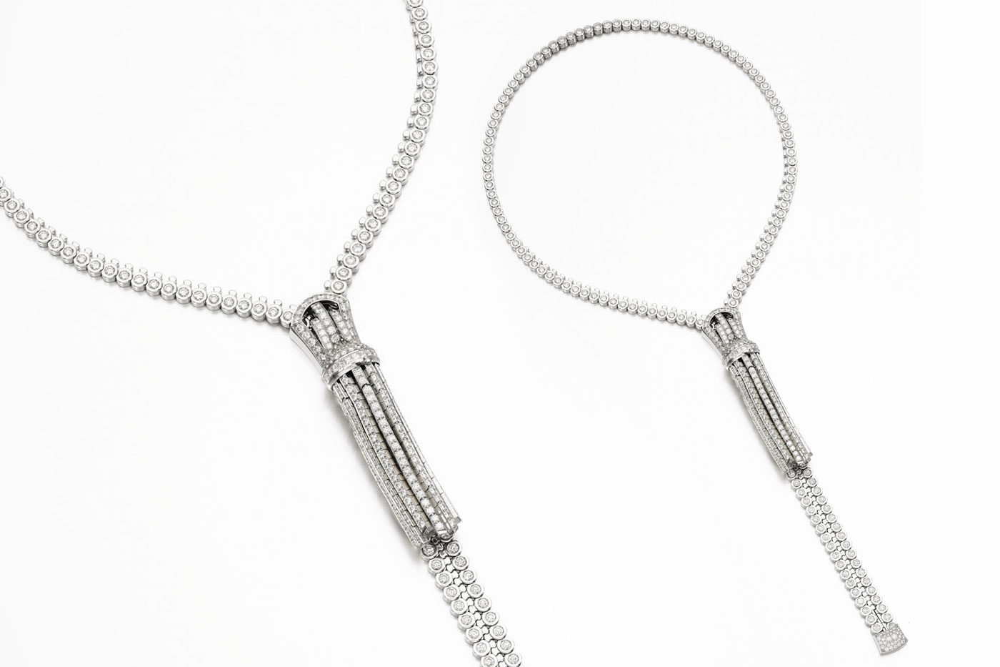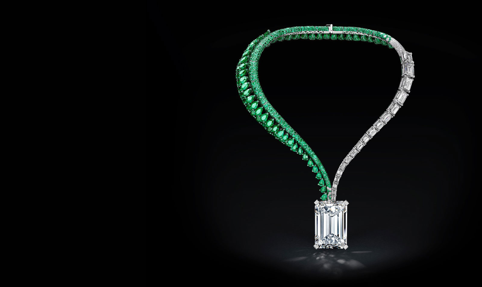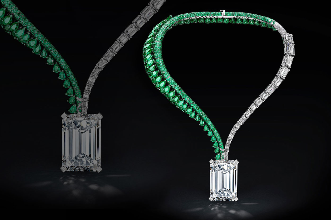 A diamond and emerald necklace featuring a record-shattering 163.41 carat "D" flawless diamond, designed and offered by de Grisogono, was sold at Christie's Geneva, for $33,705,994. The emerald-cut center stone is suspended from an asymmetrical necklace comprising of a double row of precisely matched pear-shaped emeralds, opposite a row of calibré-cut rectangular diamonds, in diminishing sizes. The design offered a perfect frame for the monumental center stone, the largest stone of this quality ever offered at auction.