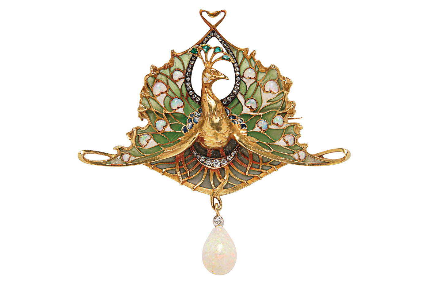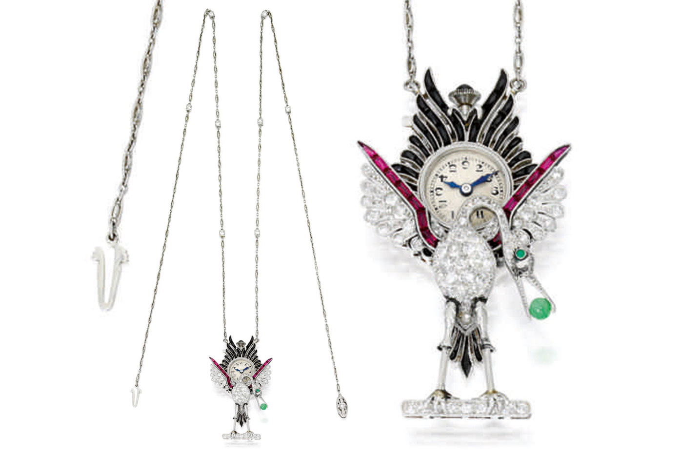 Do not despair. From time to time, an authentic replacement comes to auction for those seeking to wear a piece of the rock, or at least, a fine facsimile. Tiffany has made versions of the original through the years, using various gemstones as the rock. In the most recent auction season, several of these birds came to roost at once. Among the versions on sale was this beautiful citrine example, sold at Bonham’s for $18,750. It closely resembles the original both in the color of the gemstone as well as its multi-faceted cut. The 54-carat citrine is a fine stand-in for the priceless original – priceless because it was never up for sale. This perky diamond bird sports a yellow gold coxcomb, adding to its jaunty appearance. Sotheby’s New York sale on December 7, 2017 saw the bird perched on a cushion-cut amethyst, with one ruby eye set into its all-diamond feathered body. This colorful example sold for $25,000, well above its pre-sale estimate of $10,000-15,000. And finally, at least for this season, another bird, this one with its 18k gold feet firmly planted on a deep orangy-yellow citrine flew higher than all the rest, making $55,921 at Christie’s Hong Kong sale on November 28.