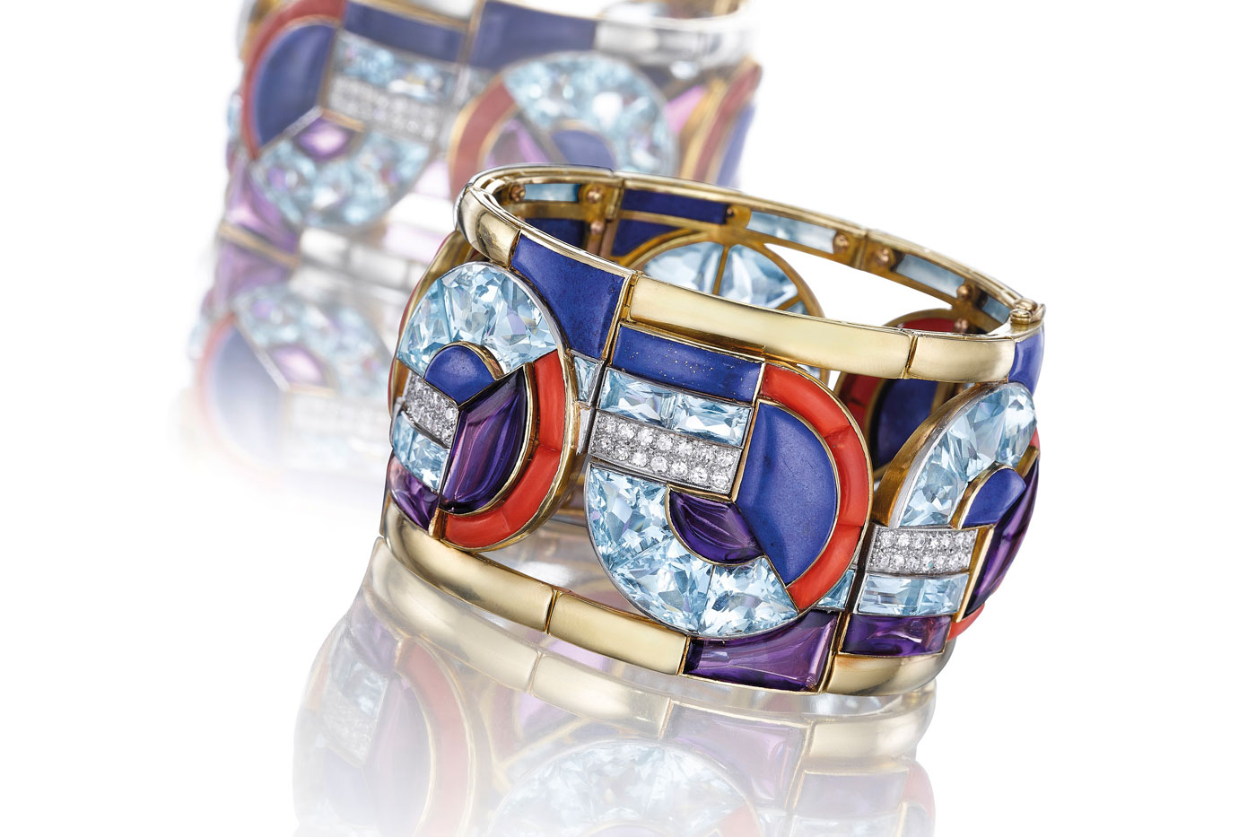 This bracelet is the ultimate expression of Art Deco, combining bold gemstones in various cuts and colors, along with single cut diamonds. The wide bracelet combines lapis lazuli, coral, amethyst and aquamarine. The gemstones, three of them opaque, the fourth transparent, were chosen for their bright, contrasting tones. All the elements were combined in a setting that is half gold and half platinum, another bold choice by the makers. Until this sale, this bracelet remained in the same family since it was purchased in 1925, a rarity of provenance that shows an appreciation for its unique beauty. The bracelet soared past its pre-sale estimate of $400,000-600,000 to over $900,000. It was sold at Christie’s New York headquarters, housed in an Art Deco building that is part of Rockefeller Center.