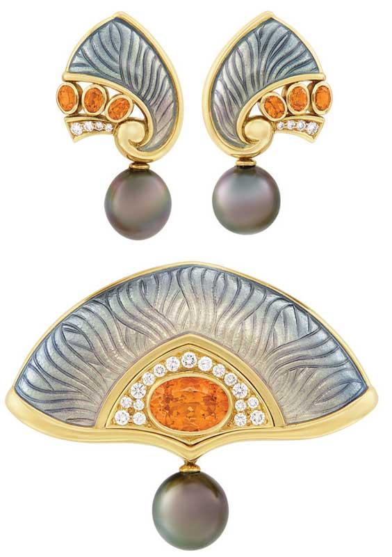 A lifetime of artistry is expressed in a brooch with matching earclips by de Vroomen. The pieces feature undulating waves of gray enamel in a fan-shaped brooch, centering an orange spessartite garnet within an arc of round diamonds, and suspending a round gray Tahitian cultured pearl. The matching earclips echo the materials and the shape of the brooch. Both pieces are set in gold frames. The rolling waves of gray enamel evoke the sea that produced the pearl.