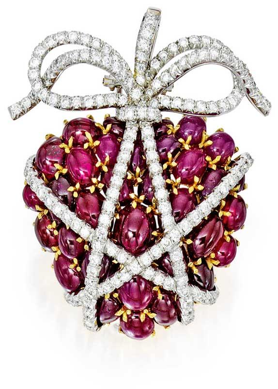 The Hollywood theme continues with this iconic ruby and diamond-wrapped heart brooch by Fulco di Verdura. The first example of the ruby and diamond heart was created by Verdura at the request of actor Tyrone Power for his wife Annabella in 1941. The heart has many appealing elements, starting with the plump cabochon rubies that look like delicious pomegranate seeds. The perfectly matched buff-top stones are set within gold prongs. Tying up the rubies with ribbons of diamonds, Verdura topped the brooch with a diamond bow.