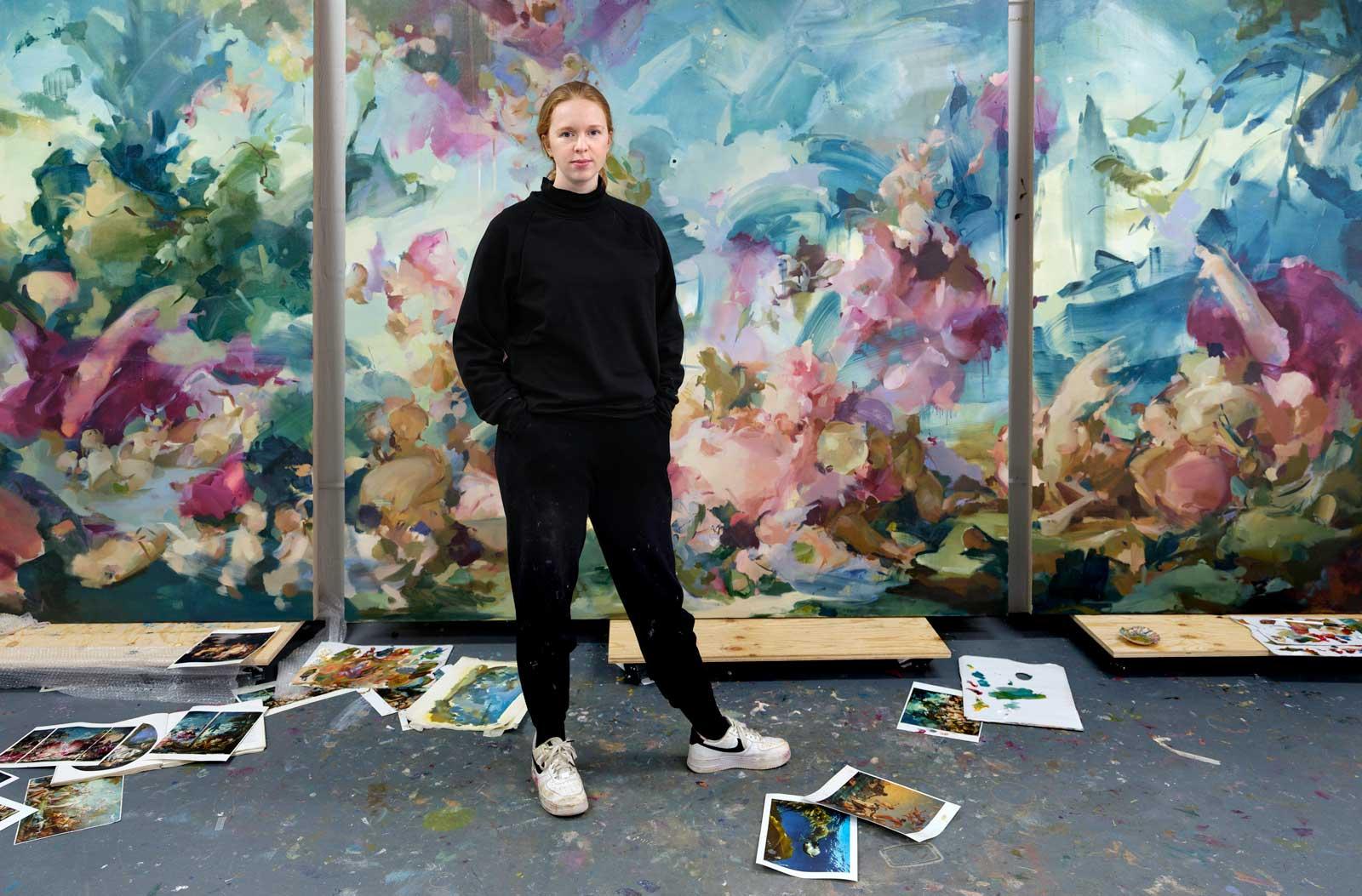 A rising star in the art world is British painter, Flora Yukhnovich. In 2021, her painting, I’ll Have What She’s Having, sold at auction for £2.3 million ($2.9 million). She’s 33. Currently on view in a two-person show with Daniel Crews-Chubb at the Ashmolean Museum in Oxford, England, Yukhnovich has six new large-scale paintings, created for the contemporary exhibition series, ‘Ashmolean NOW,” which was launched in the summer of 2023 and invites artists to create work inspired by the historical collections at the Ashmolean. The paintings are, in a word, gorgeous.