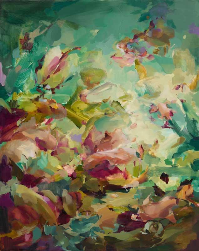 It’s exciting to see a young artist luxuriating in the paint. You can feel her love of oil paint by the way she applies the material thick and diluted contrasting light and dark, layering paint with loose and controlled brushstrokes. And the colors! Plump pink and rose, purple and turquoise, creamy white and black—the colors stream across the canvas like a song. These are luminous paintings, and deserving of praise.