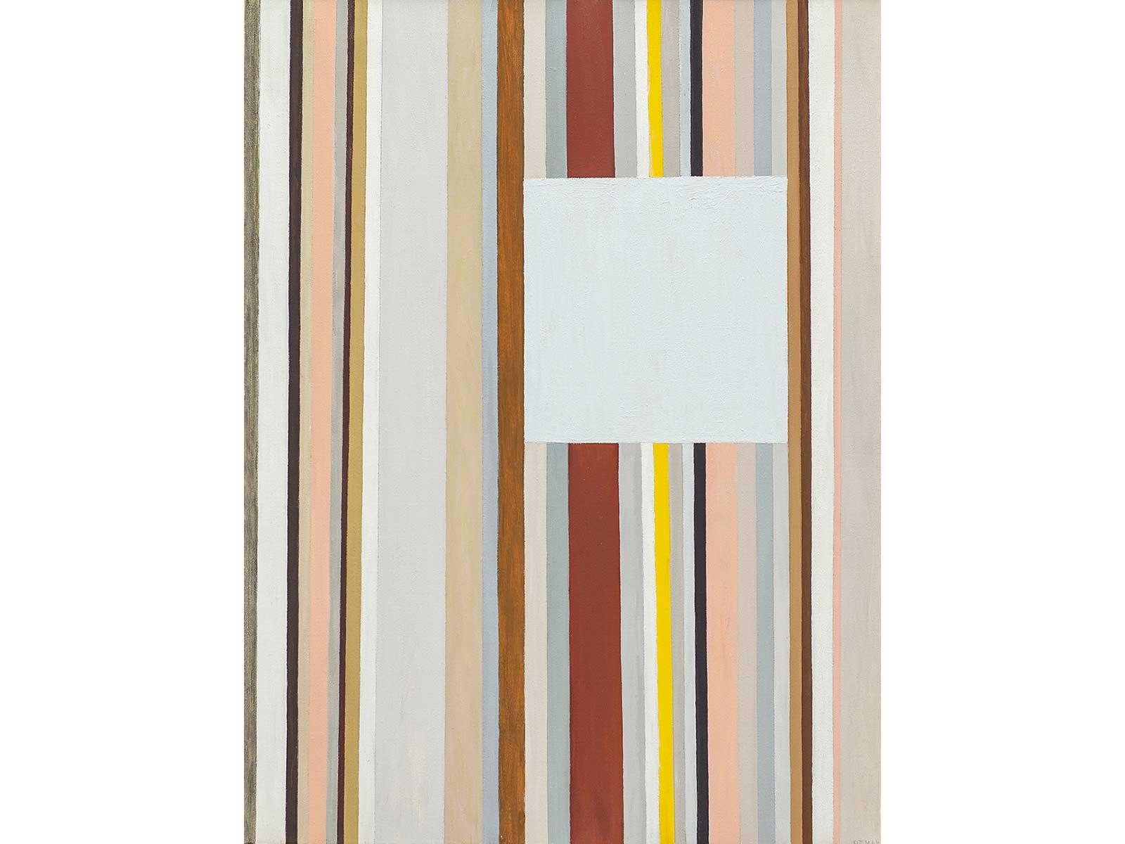 Her uncompromising style, refuting gestural Abstract Expressionism was quite unlike anybody else’s. Though her paintings evoke in many ways the clarity of geometric abstractionists, the color relations and elegant forms of the modernists, but more than anything, her Shutter Paintings are slyly active, featuring narrow apertures. The stripes appear to expand and contract, generating a sense of motion and even sexuality as triangles merge. Looking at Mason’s paintings of the 1960s, we note, above all, that everything is a little bit different from the other paintings being done, albeit clearly in communication with the modernist lingo.