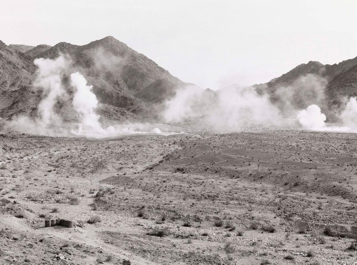 Hiroshi Sugimoto’s triptych, Adriatic Sea, Gargano I, resonates with Marville’s and the Bechers’ typologies, but is also a study in grayscale formalism. Images from An-My Lê’s documentary series, 29 Palms, read like documentary but are not purely so. Shot at a Marine Corps training facility in the Mojave Desert during the Iraq War, they document the rehearsal for combat, not the frontlines. Taken at a distance, they resemble Alexander Gardner’s battlefields more than they do modern photojournalism.