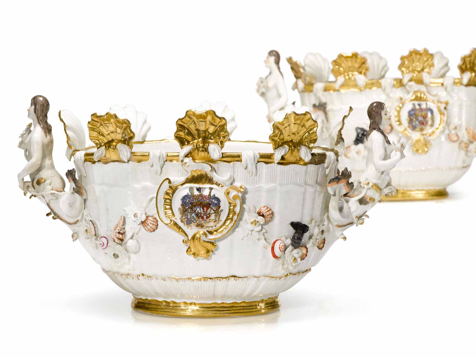 When you look at a pair of monteiths from Meissen’s Swan service, a legendary 18th century collection of porcelain tableware, you understand why inviting guests over for dinner earned the name “entertaining.” Decorated with figures of comely maidens, gilded shells, flowers, and plenty of gilt, the fanciful ceramics are more entertaining than a pair of bowls meant for cooling and rinsing wine glasses have a right to be. (The notches visible between the gilded shells along the rims of the bowls are stem rests.) The monteiths sold for $212,500 against an estimate of $150,000 to $250,000 in Sotheby’s auction of property that once belonged to the late Nelson and Happy Rockefeller. It was the most prominent example from Meissen’s Swan service in the auction, which included 16 pieces in 14 lots that collectively commanded $735,000 against a total estimate of $439,000 to $691,000. (The auction’s grand total was $3.3 million.)