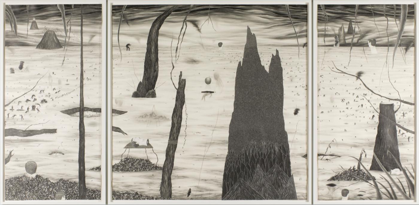 Robyn O’Neil, Hell, 2011. Graphite and collage on paper, triptych.