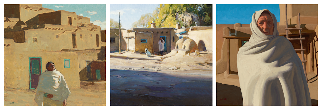 Taos Perspective (triptych), 12 x 12 in. panels, oil; left to right, Glenn Dean, Josh Elliott, Logan Maxwell Hagege