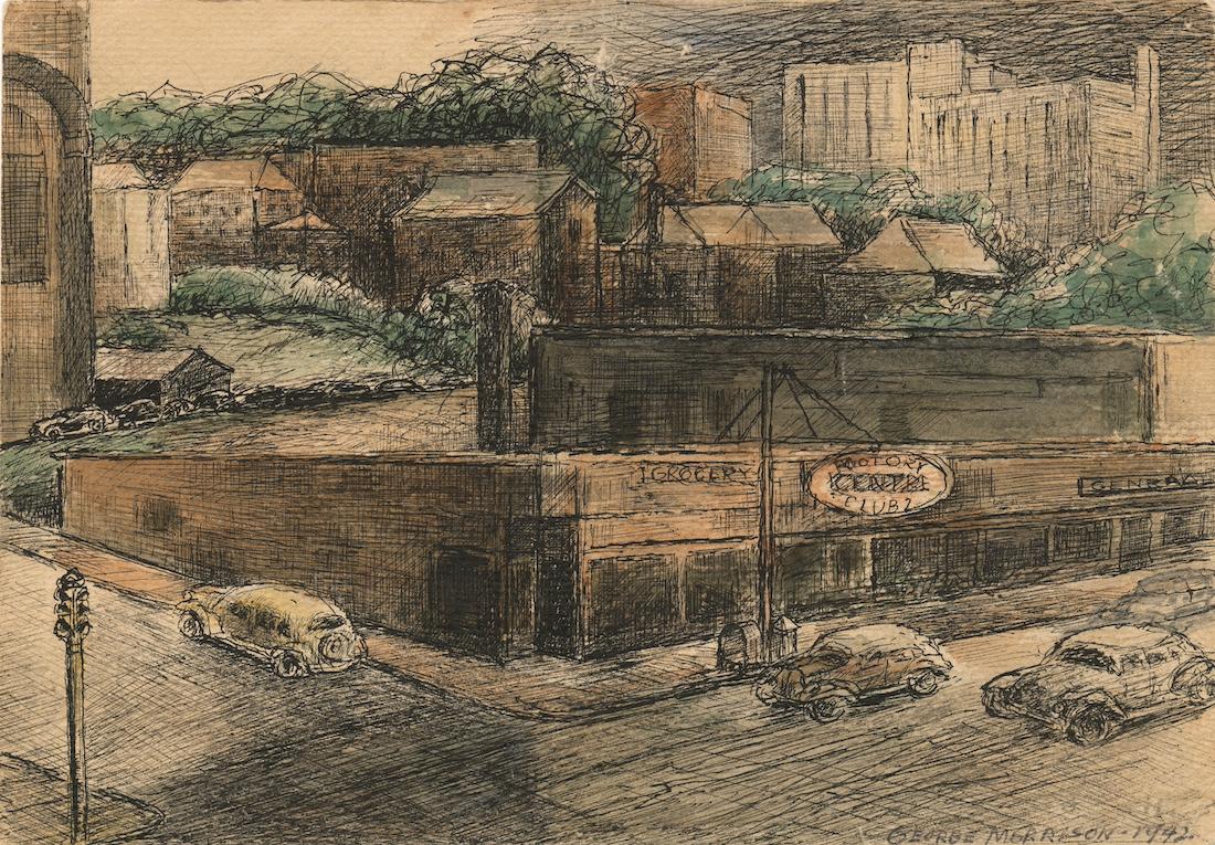 George Morrison, Native American, Grand Portage Chippewa, 1919–2000, Duluth Corner, 1942, Pen and ink on paper, 6 × 8 5/8 in. (15.2 × 21.9 cm)