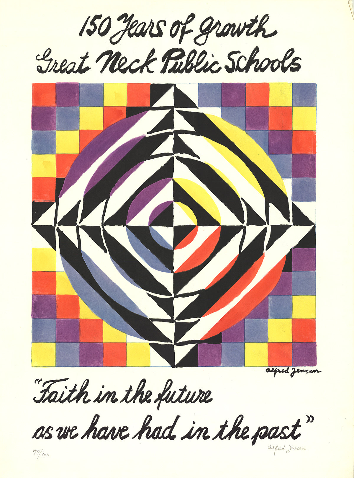 "150 Years of Growth Great Neck Public Schools" by Alfred Jensen, Signed Serigraph printed in 1965 from an edition size of 100. The overall size of the Serigraph is 40 x 29.5 inches. The condition of this piece has been graded as B: Very Good Condition, with signs of handling or age. Here is some supplemental information about the Serigraph: Hand signed and numbered out of 100 in pencil by Jensen. Stamped on the reverse "Maurel Studio NYC, Hand Printed, Sheila Marbain".