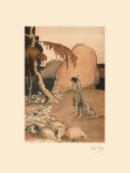 Abel Pann (1883-1963) was regarded as the foremost Land of Israel Painter. This view was shared by the Jewish community throughout the world and by the general public in pre-State Israel where reproductions of his works were hung in almost every home. Pann was born in 1883 in the town of Kreslawka in the Vitebsk region of White Russia. His father Nahum was a rabbi and head of a yeshiva, a religious academy. Pann received a Jewish elementary school education until he was twelve. He studied the fundamentals of drawing for three months with the painter Yehuda Pen of Vitebsk, who also taught Marc Chagall and Ossip Zadkine. When he was twelve he traveled between Russian and Poland, earning money as an apprentice in sign workshops. In 1898 he went south to Odessa, where he was accepted by the Academy of Fine Arts. In 1903 Pann moved to Paris, where his work included depictions of Jewish daily life, Parisian genre paintings, as well as sketches and caricatures that were humorous and psychological criticisms regarding society. His empathy for the poor and wretched became well known. In 1912, the director of the Bezalel School of Art and Crafts in Jerusalem asked Pann to teach at the school which he accepted a year later. During the first year of World War I, Pann was restricted to leave Europe after he returned to recover belongings to take back to Jerusalem. During the first years of the war, he concentrated on popular, nationalist posters and illustrations, including depictions of the cruelty of the German enemy. In 1920 he returned to Jerusalem and resumed teaching at the Bezalel School, and formed the Palestine Art Publishing Company with which he used to print his albums of Bible illustrations. Pann was part of a movement of contemporary Jewish artists interested in Biblical scenes, influenced by Art Nouveau and the Symbolist movement. In 1924 Pann resigned from teaching to devote himself full-time to lithography.