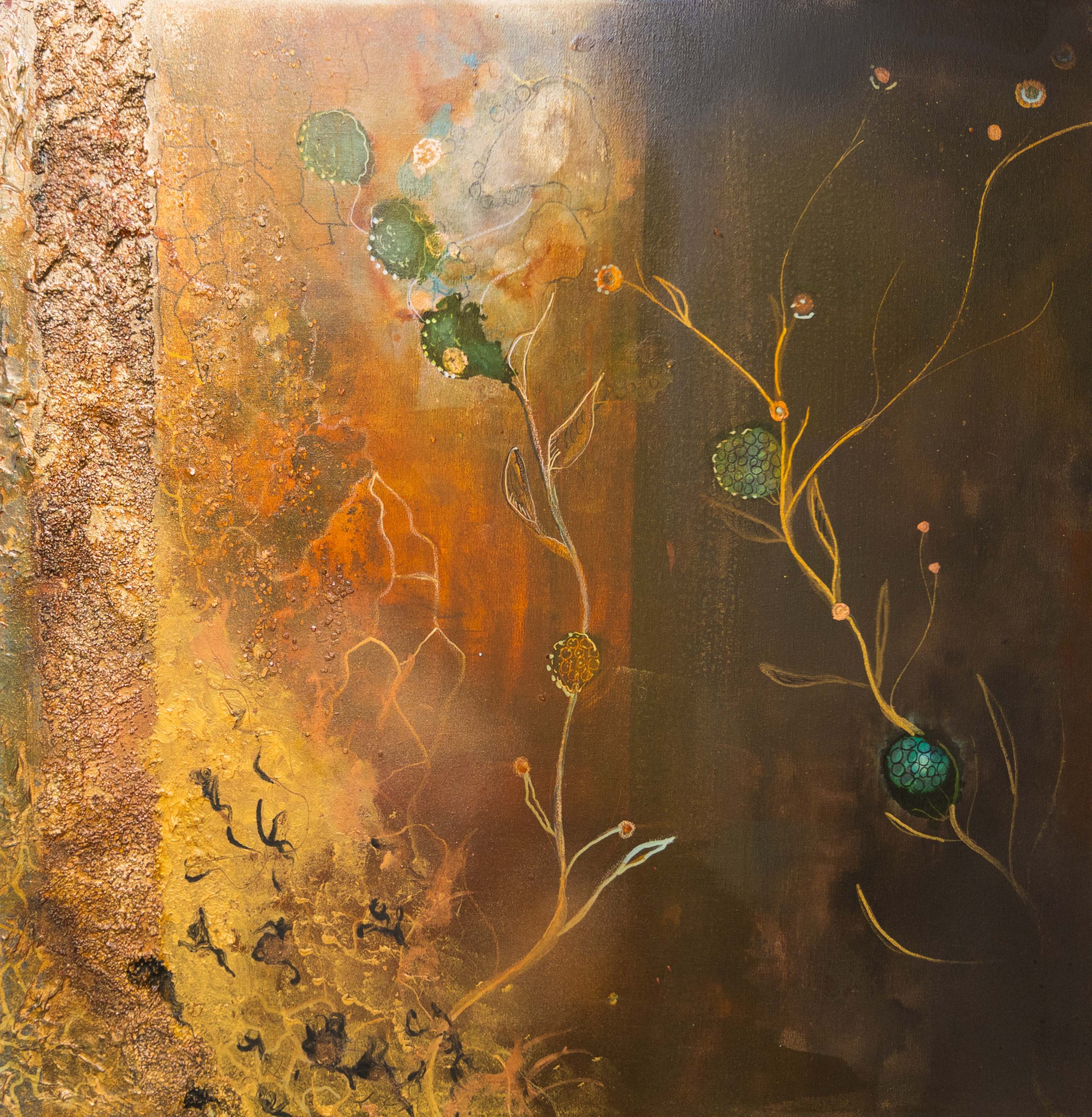 My painting series is inspired by the elements of Earth and beyond and its organic depth of color. I see inspiration in landforms from above, water’s transparency and movement, rocks and minerals and their multiple layers of colors. Many of the materials used in painting are derived from elements of the earth and I use these elements to build something abstract and yet symbolic of what our planet is made of. Circles also have a symbolic meaning of infinity, balance, returning cycles, and the cosmos. I am creating a story of our planet but most importantly a dialogue about climate change and what is infinite or finite. My paintings combine a mixed media of acrylic, oil, ink, and vinyl, spray paint, gold and bronze powder, mica, and melted plastic on linen canvas. We need to preserve our natural environment to create a more peaceful world.