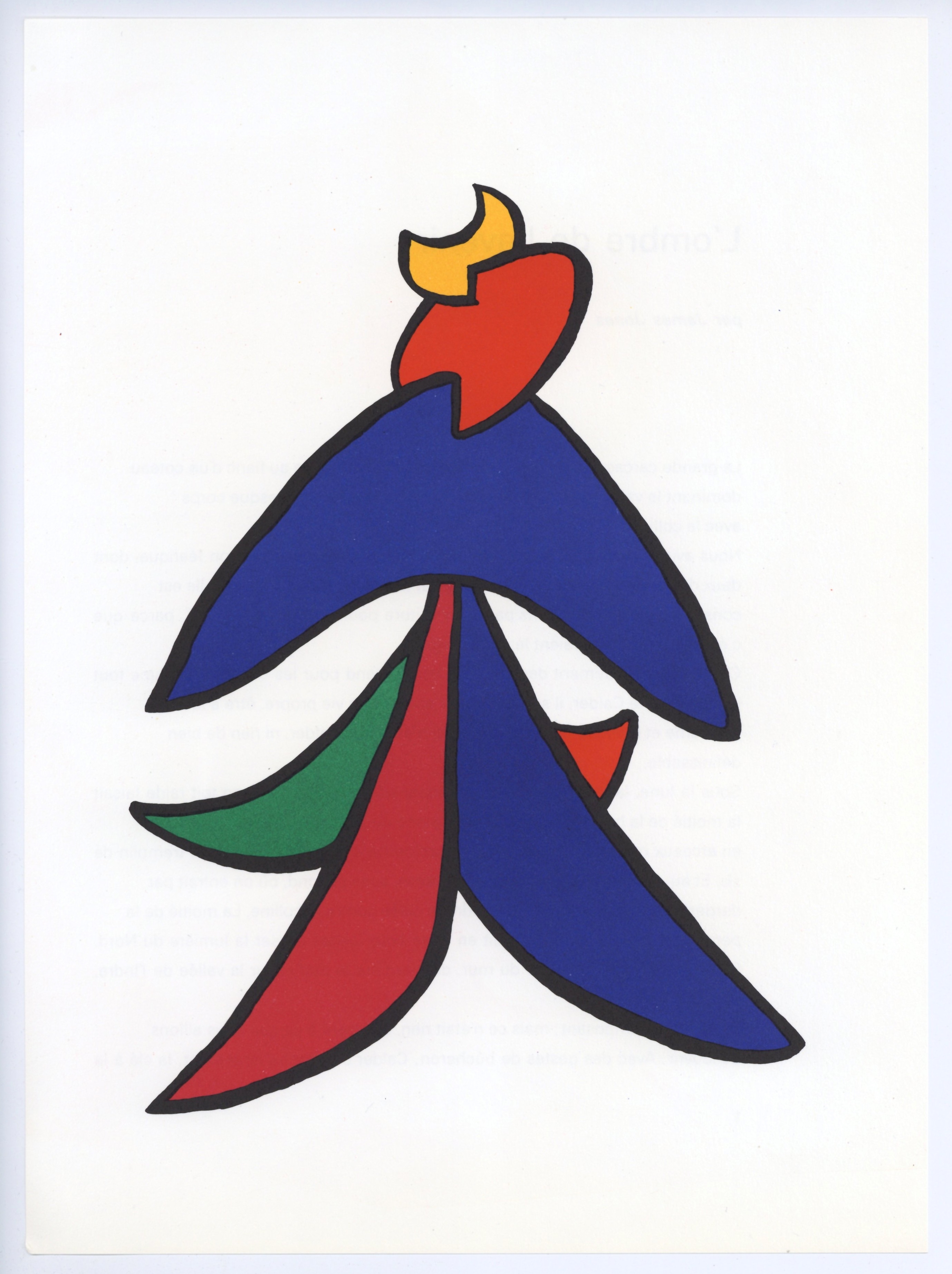 Medium: original lithograph. This is one of the Alexander Calder lithographs from his "Stabiles" series, printed in 1963 for the art revue Derriere le Miroir (issue number 141) and published in Paris by Maeght. Size: 15 x 11 inches (380 x 277 mm). There is printed text on the back side, as published. Not signed.