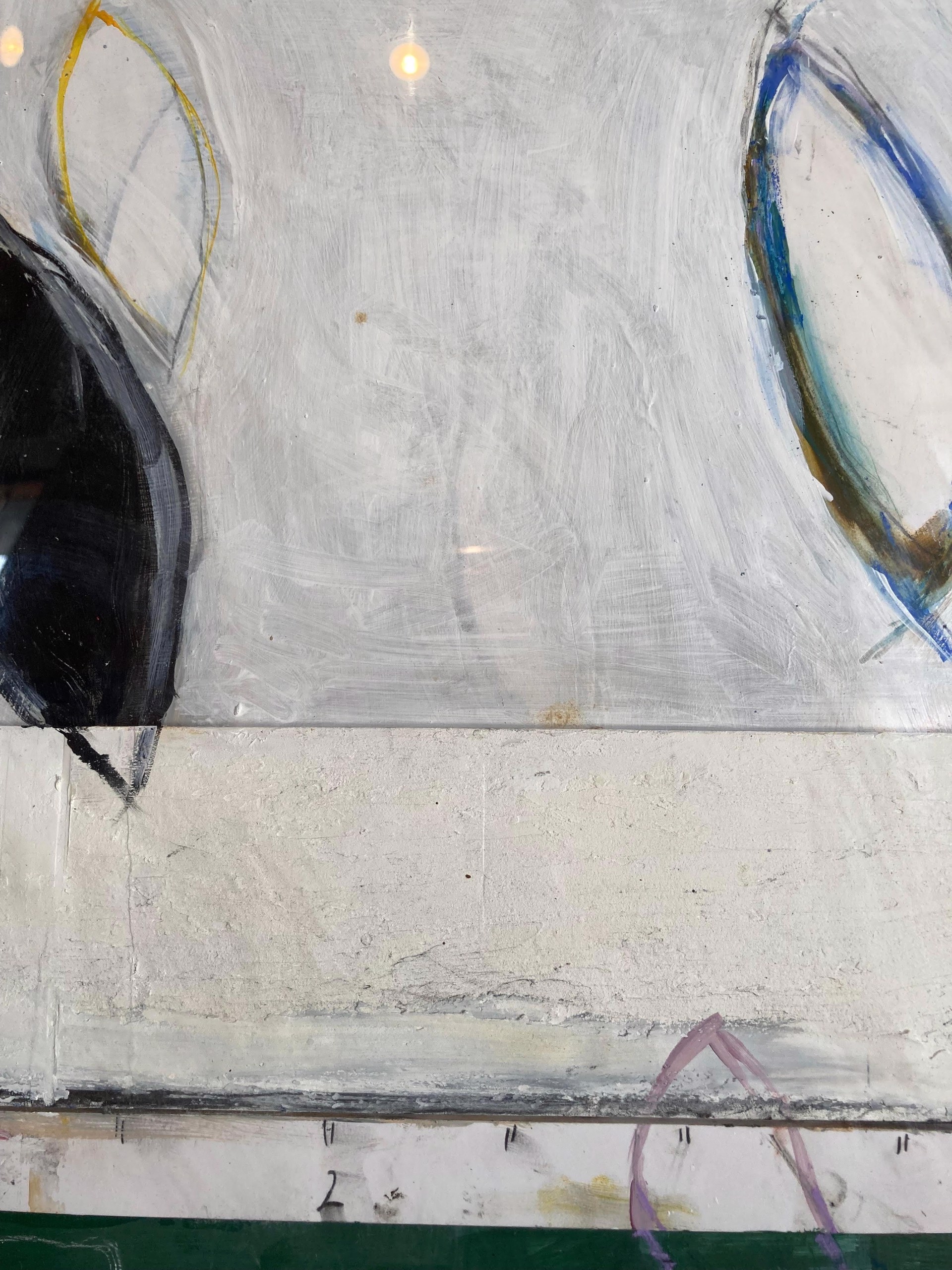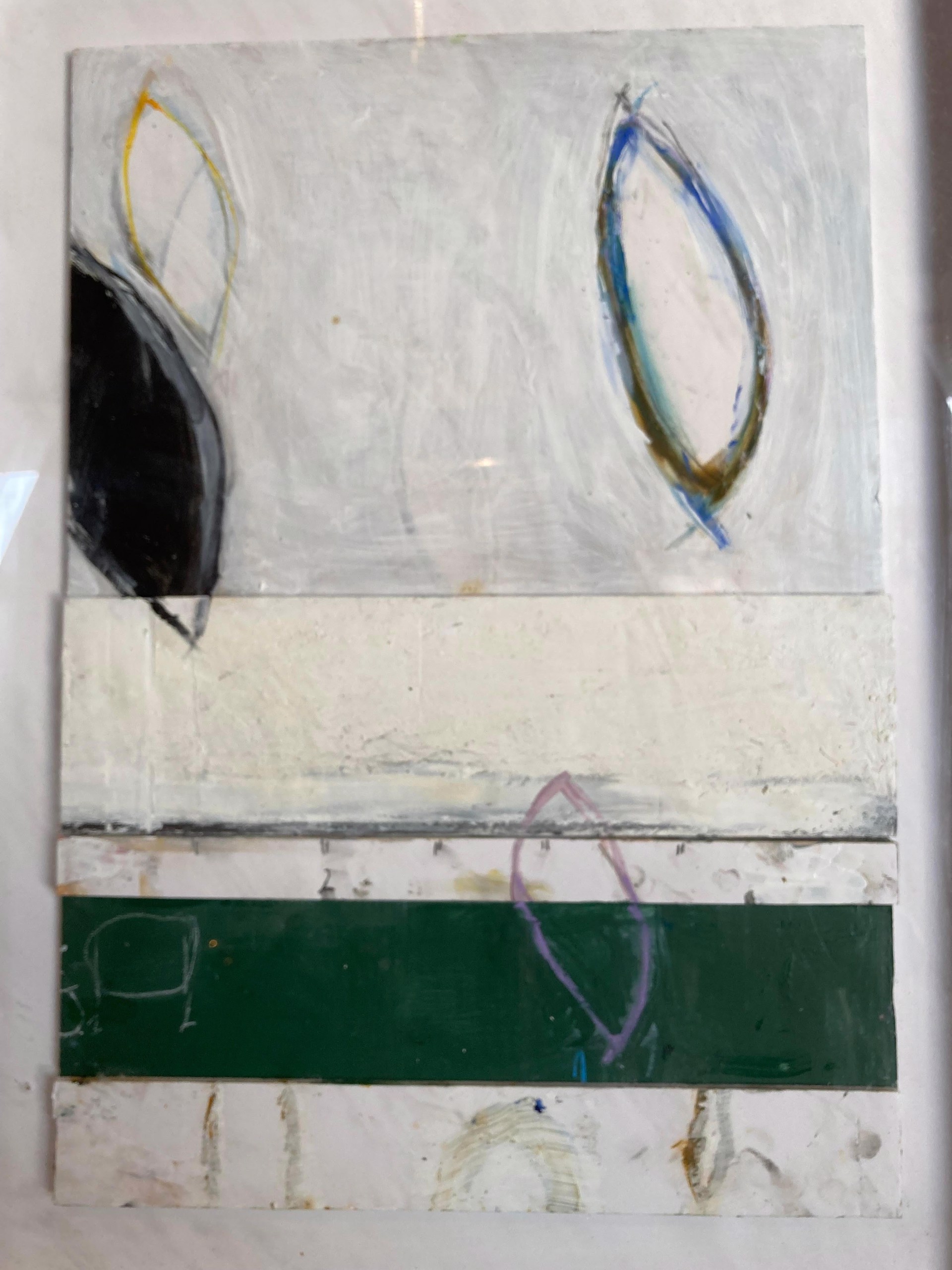 Artist's Statement: "Back in 2012/2013 I was making these complex assemblage pieces using foam core slats with oil, wax, tar, chalkboard paint and chalk, all kinds of materials. I felt sort of like Paul Klee, just going all over the place with the qualities of the various media. These were very nicely framed in custom shadow box frames, and I kept a couple back for myself, of which this is one." 26.75 x 20.50 in