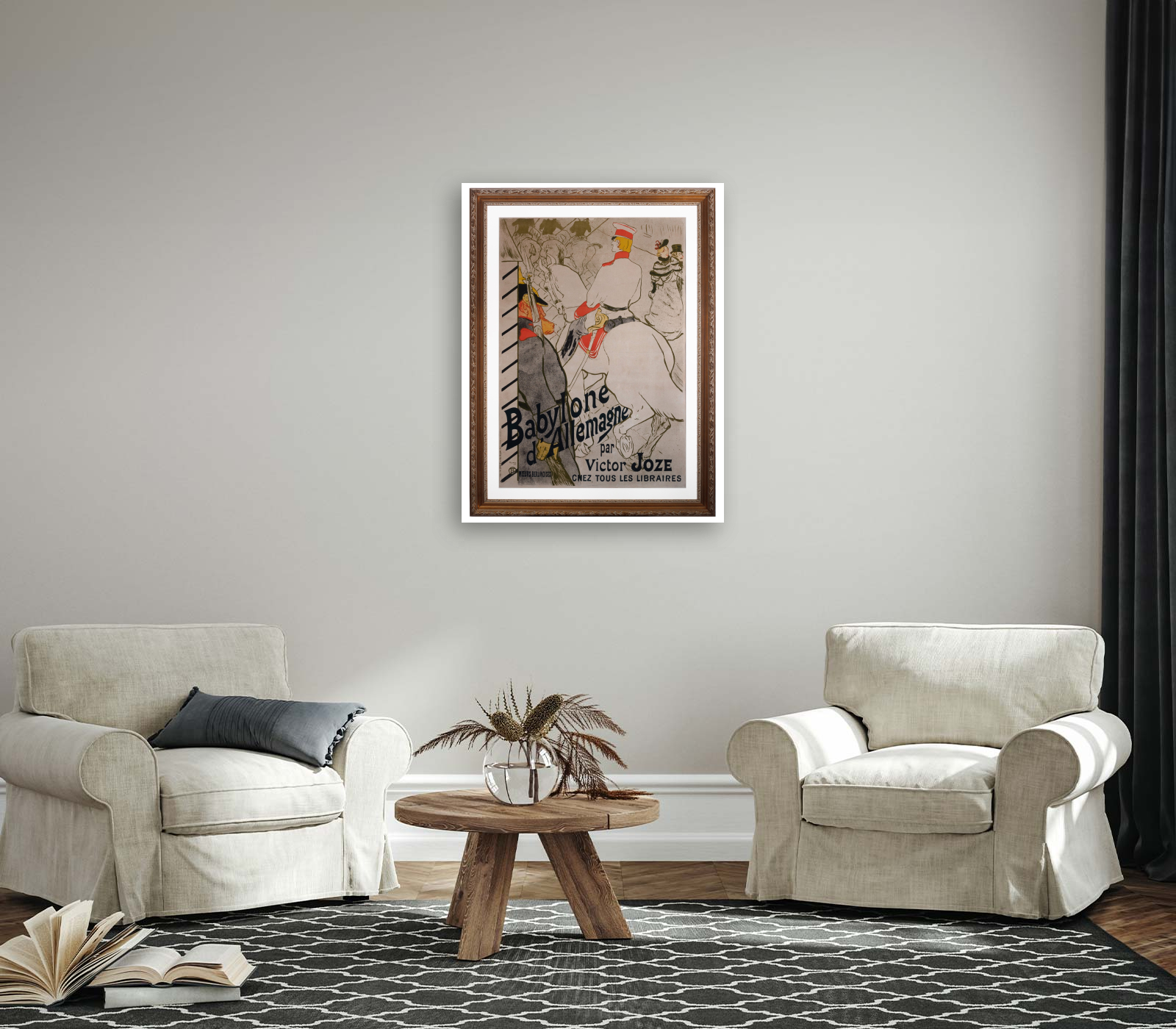 "Babylone d'Allemagne" or "German Babylon" is an original lithograph poster by the lauded artist of the Art Nouveau style Henri de Toulouse-Lautrec. This is the second poster that Lautrec designed to advertise a novel by the Polish author Victor Joze. In the poster, a stiff Prussian officer sits atop a horse, a not-so-subtle jab at the German military. Indeed, the poster caused a stir, offending the German ambassador to France and nearly starting an international incident. The poster as it appears is the second state: the first state of the poster contains none of the text of the title of the book, which was added later by a hand other than that of Lautrec. The text of the poster reads: "Babylone d'Allemagne par Victor Joze chez tous les libraries," or "Babylon of Germany by Victor Joze at all libraries" Original color lithograph, brush and spatter technique used, printed in five colors on cream woven paper.