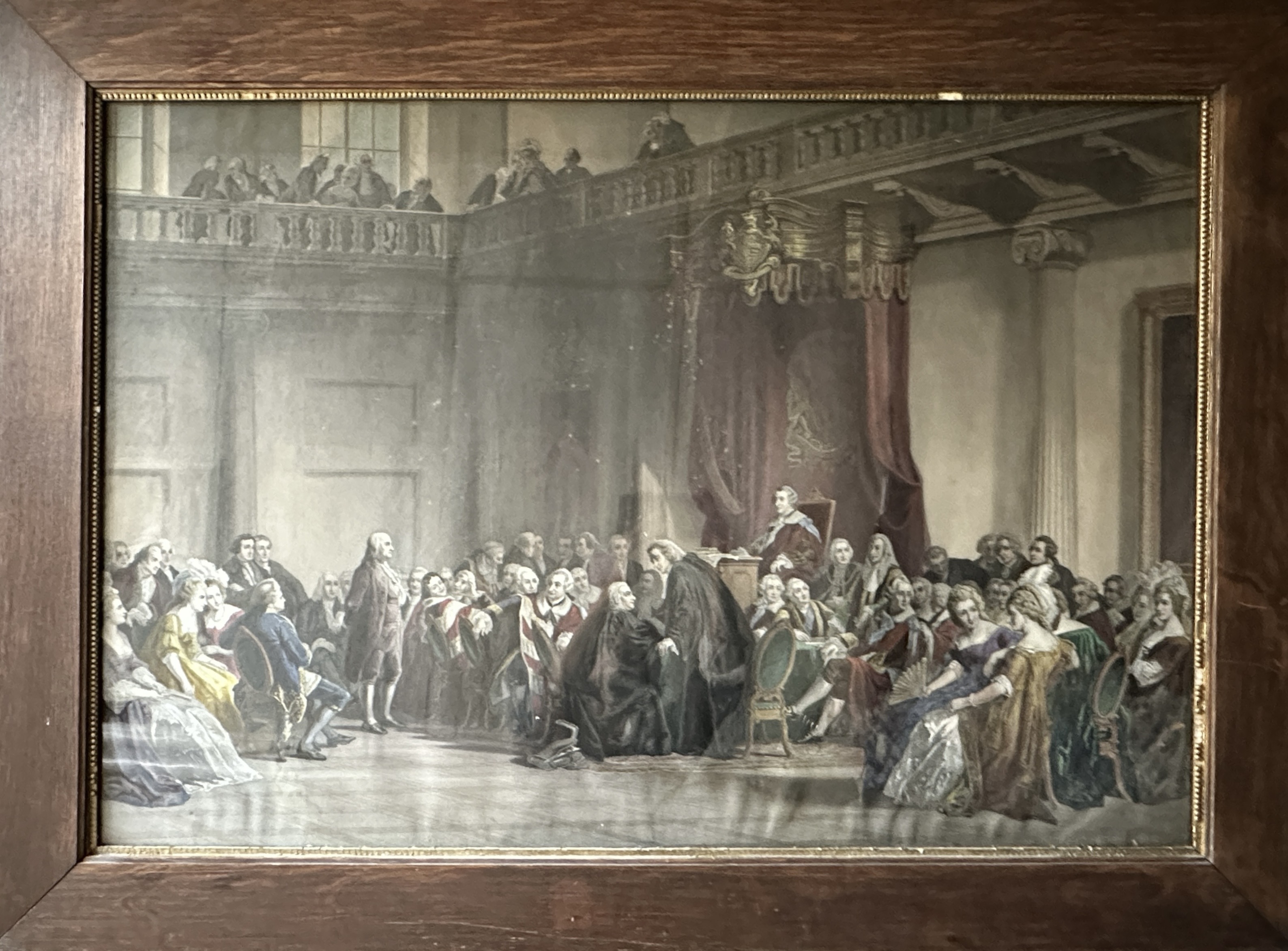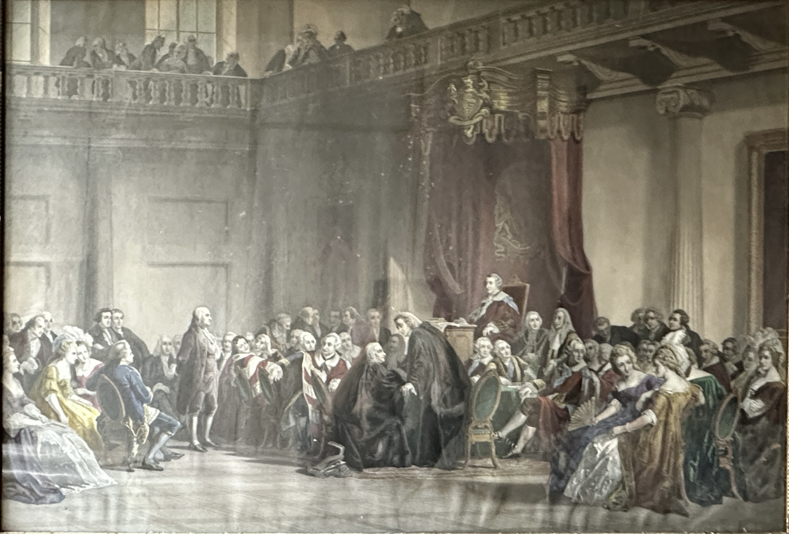 Hand colored 1859 engraving depicting Benjamin Franklin at the Court of Saint James after a painting by Christian Schussele, sight measurements of image 26 in x 39 in, frame measures 33.5 in x 45.5 in, not examined out of frame. Antique wooden frame is in fair condition with much of the gold decoration damaged or missing from on the interior edge.