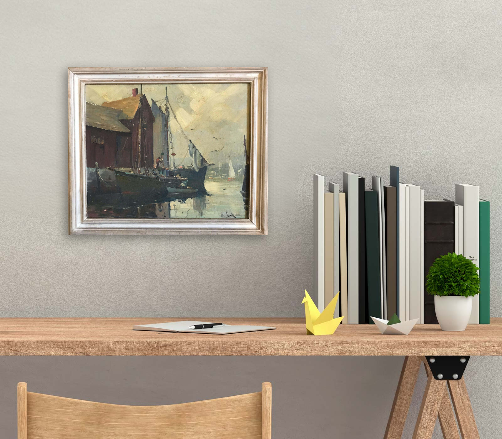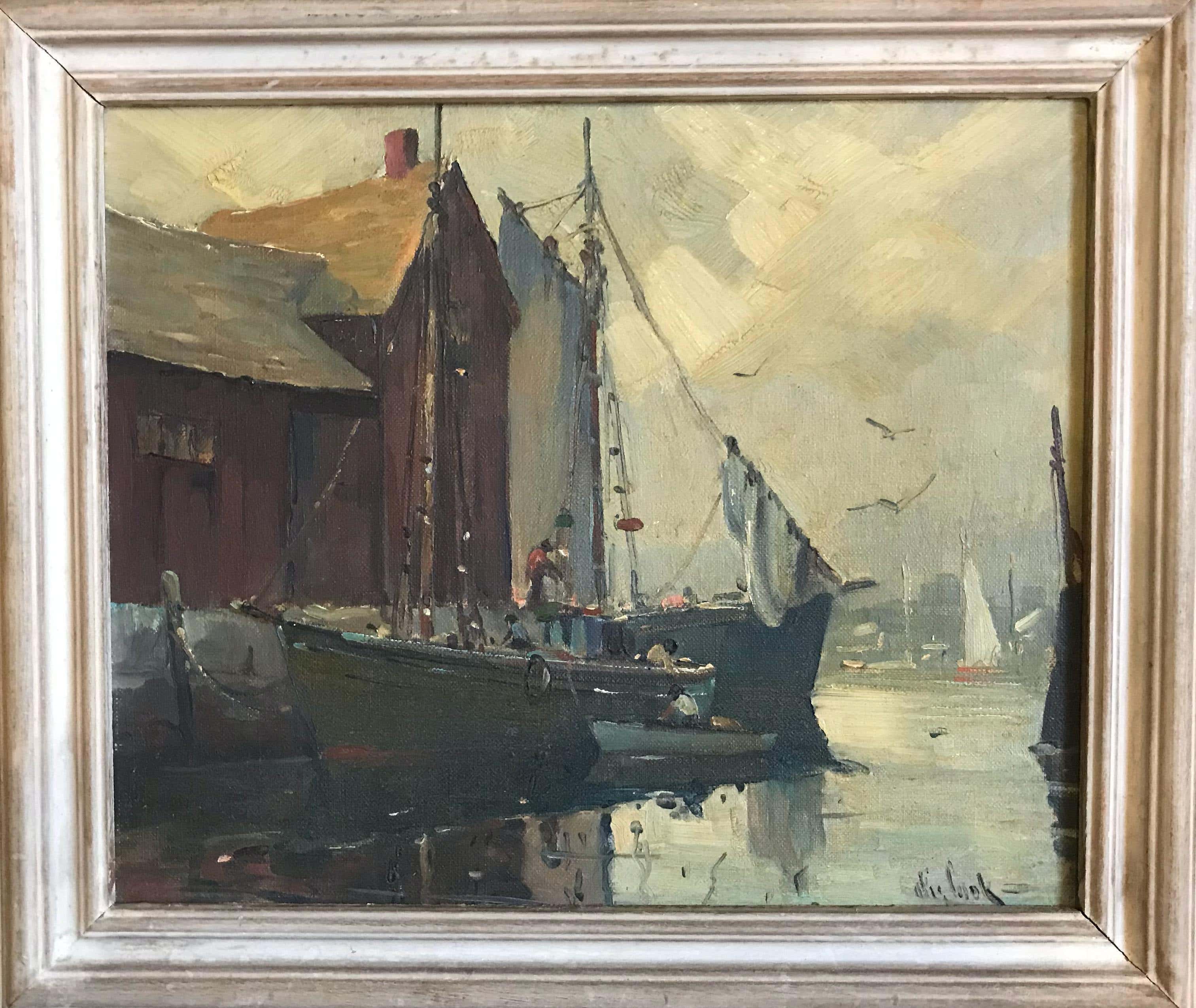 A charming port scene by famous and super highly-listed Massachusetts painter Otis Pierce Cook. He is best known for these nautical and port scenes, so this is very typical of his work. I have included his two most recent auction records so you can see that his work is quite sought after (and remember, auction prices are wholesale, the lowest they get, and tax is added later). The picture is 10" x 12" without the frame. Here is information about Cook pulled from AskArt: "Born in New Bedford, Massachusetts, Otis Cook settled in Rockport. He studied at the Swain School of Design in New Bedford and with Emil Gruppe in Gloucester. He was active in the North Shore Art Association, the Guild of Boston Artists, and the Boston Society." Source: Peter Falk, "Who Was Who in American Art" --------------------------------------------------------------------- "Otis Cook was born in Bedford, Mass. Member of the Guild of Boston Artists. Rockport Art Association. North Shore Arts Association, Academic Artists of Springfield, Independent Artists of Boston, and Longboat Key Art Center, Longboat Key, Florida. He has won several awards at the Jordan Marsh Exhibit as well as at the Rockport Art Association and Springfield Academic Artists, and others." "Artists of the Rockport Art Association. Fourth Edition. A pictorial and descriptive record of The Oldest Art Organization on Cape Ann. Published by The Rockport Art Association., Rockport, Massachusetts, 1964."