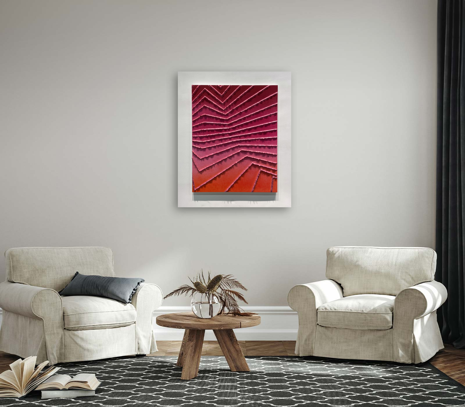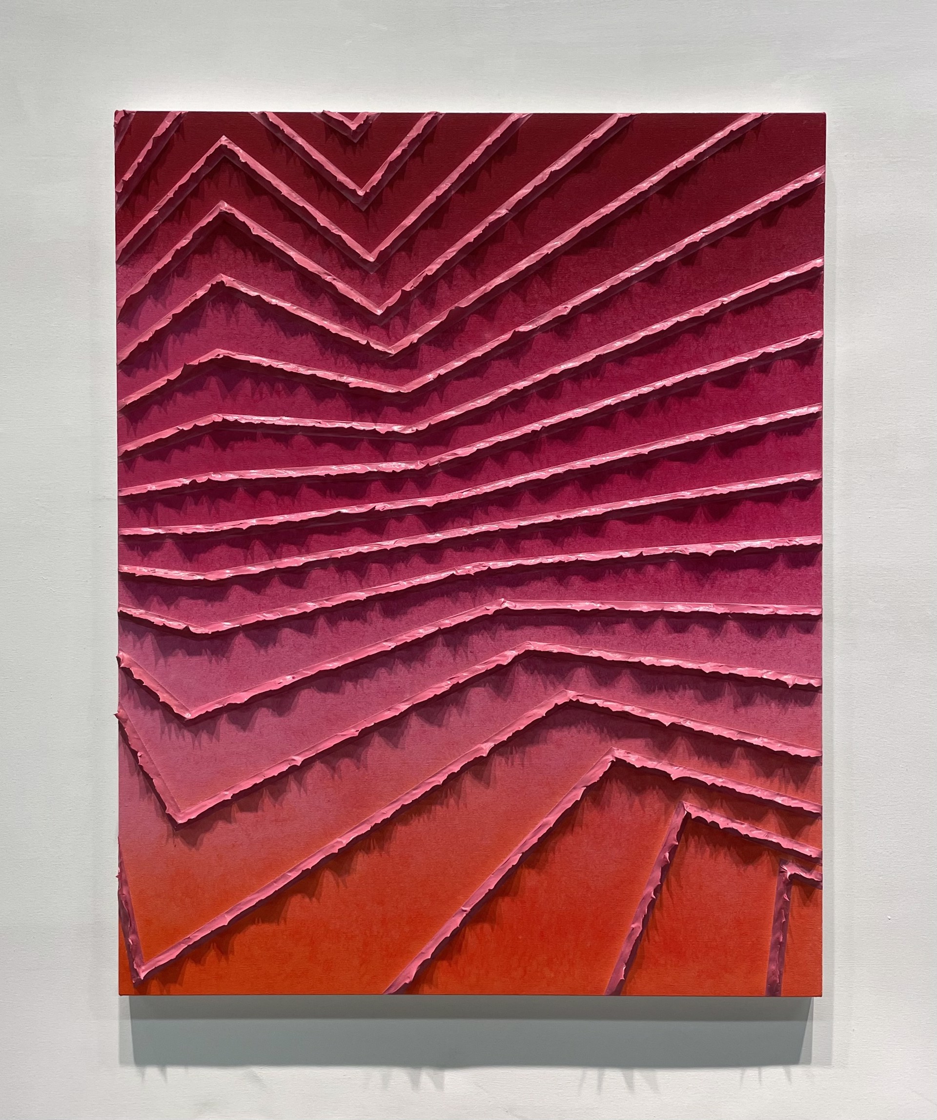 "Chili Pepper Lipstick" is an acrylic painting on canvas that is part of Daniel Klewer’s series “Linear Tactility.” Unlike some of the artist’s other works in which he paints straight lines, Klewer employs broken lines in "Chili Pepper Lipstick," which creates a sense of depth that is also enhanced by the raised lines and shaded color of the paint. The artist begins with a minimalist template—lines of paint on a canvas. However, the work belies minimalism with its attention to texture and lush color. The artist moves away from a brushed application of paint. The raised lines of paint have a tactile and sculptural effect, blurring the line between painting and sculpture. The sculptural paint seems to reach out toward the viewer, while the color draws the eye back to the surface of the painting. The raised lines of paint also cast shadows, enhancing the sculptural nature of the work and constantly changing the work’s color and the viewer’s experience of it. Klewer investigates the visual and psychological resonance of color relationships in his work. The works’ titles are also a significant part of the work. Klewer chooses evocative words that are at once random and intentional. The resultant titles add another dimension to the interpretation of the paintings.