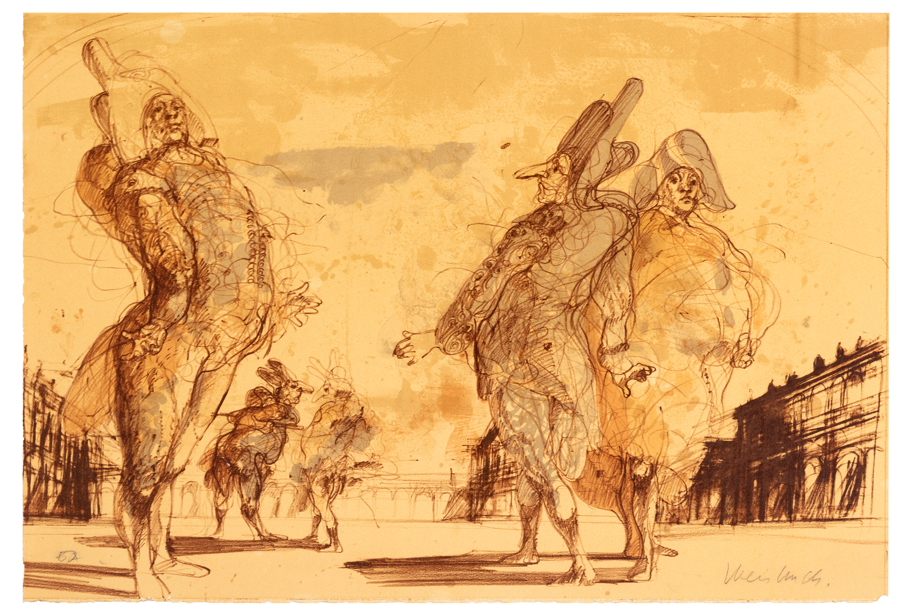 Claude Weisbuch was born in Thionville, France in 1927, and was a pupil at L'Ecole des Beaux-Arts de Nancy, France. As a painter, engraver, and lithographer, Weisbuch depicts subjects such as puppets, harlequins, musicians, equestrian scenes, opera, and dancers. In 1961, he received the Critics' Prize. In 1968, he became a full member of the Society of French painters-engravers. A velvety line dominates his work. Using only a few earth tones as well as black and white, Weisbuch emphasized movement and form through line weight and tone. As a theatre and classical music enthusiast, the artist had a flair for what is raw, ecstatic, and controlled. "I like the sketch, the uncompleted the painting filled with mystery." His work is mainly devoted to engraving. According to Patrick Waldberg, "man appears as an obsessive theme in Weisbuch's work, either that he strives to capture it in the mirror by contemplating his own image, or that he surprises him in the features of his visitors, or that he is trying to decipher it among the masters of the past that he worships, Jacques Callot, Rembrandt or Honore Daumier." His works have the appearance of unfinished sketches, mixing few colors but with great liveliness of line. He died in 2014 in Paris.