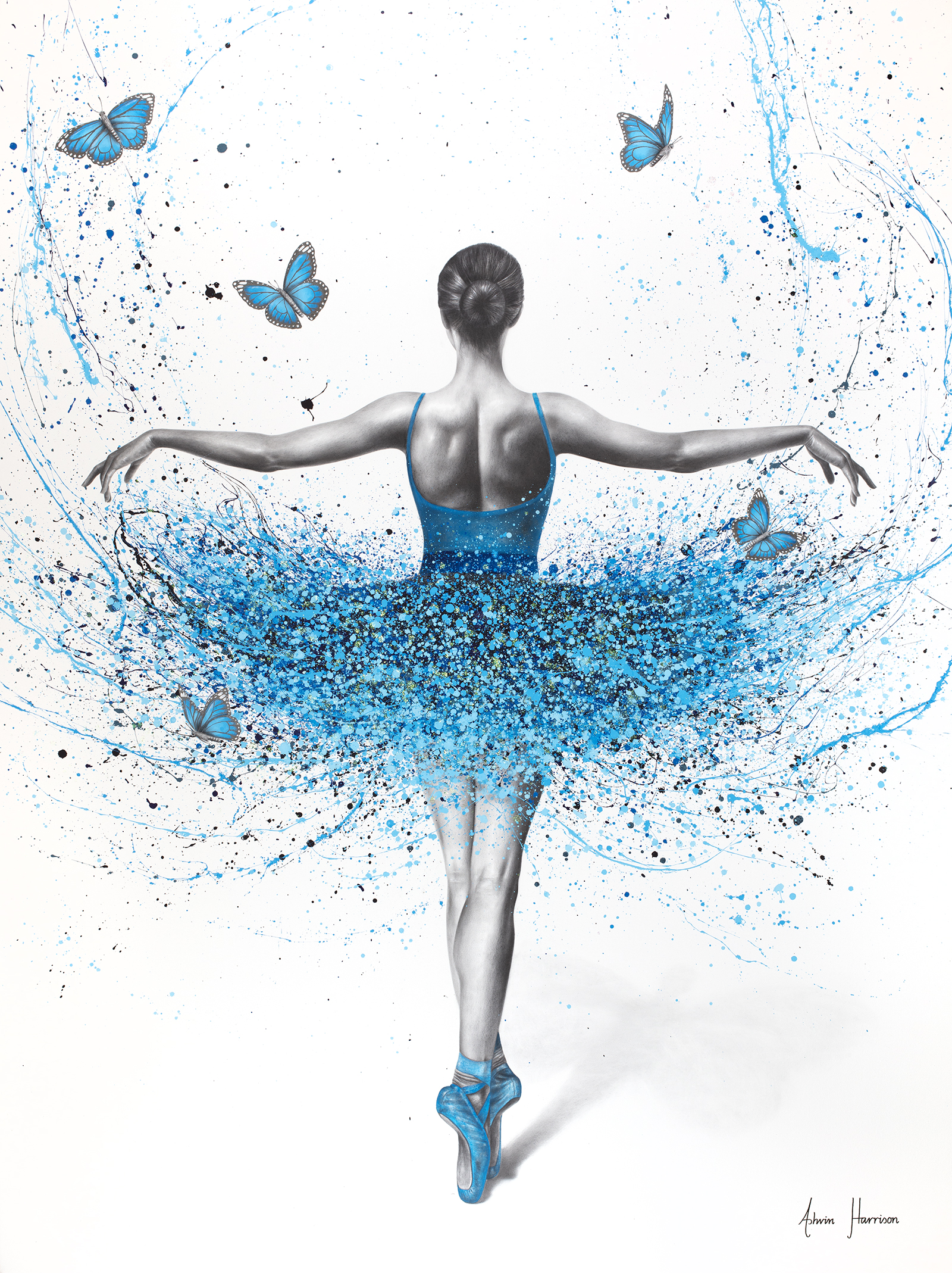 An artwork inspired by a love of dance and nature. The beautiful ballet dancer is in a dream of nature with her wings hinted in the shadow of her dance below. The butterflies both guide her positive change and inspire her next formation. This coconut charcoal and acrylic painting on fine art rolled canvas is an expression of life through thought, emotion with fine art realism, expressionism and abstract styles. Coconut charcoal powder provides the representational structure for the ballerina in dance pose, using a unique and also made up technique with paint brushes.
