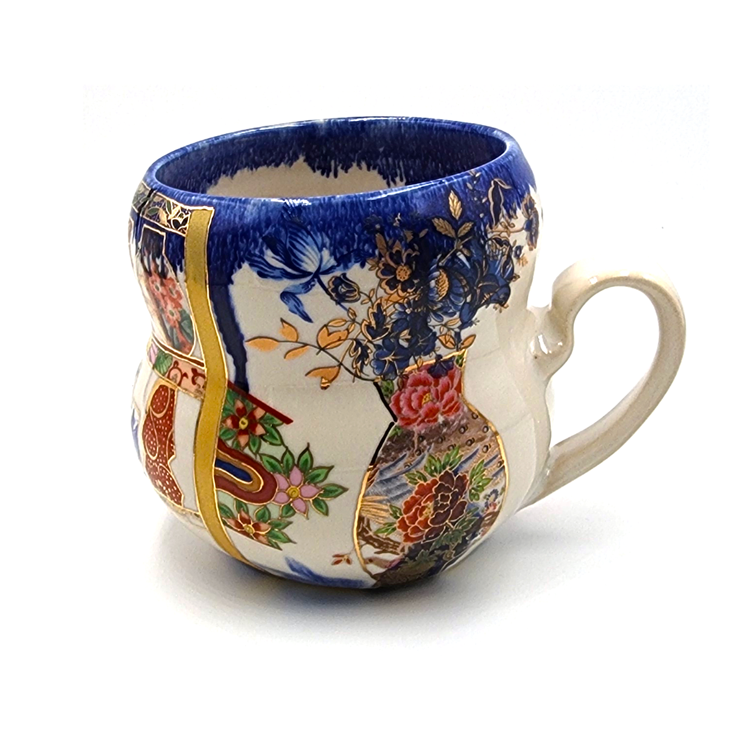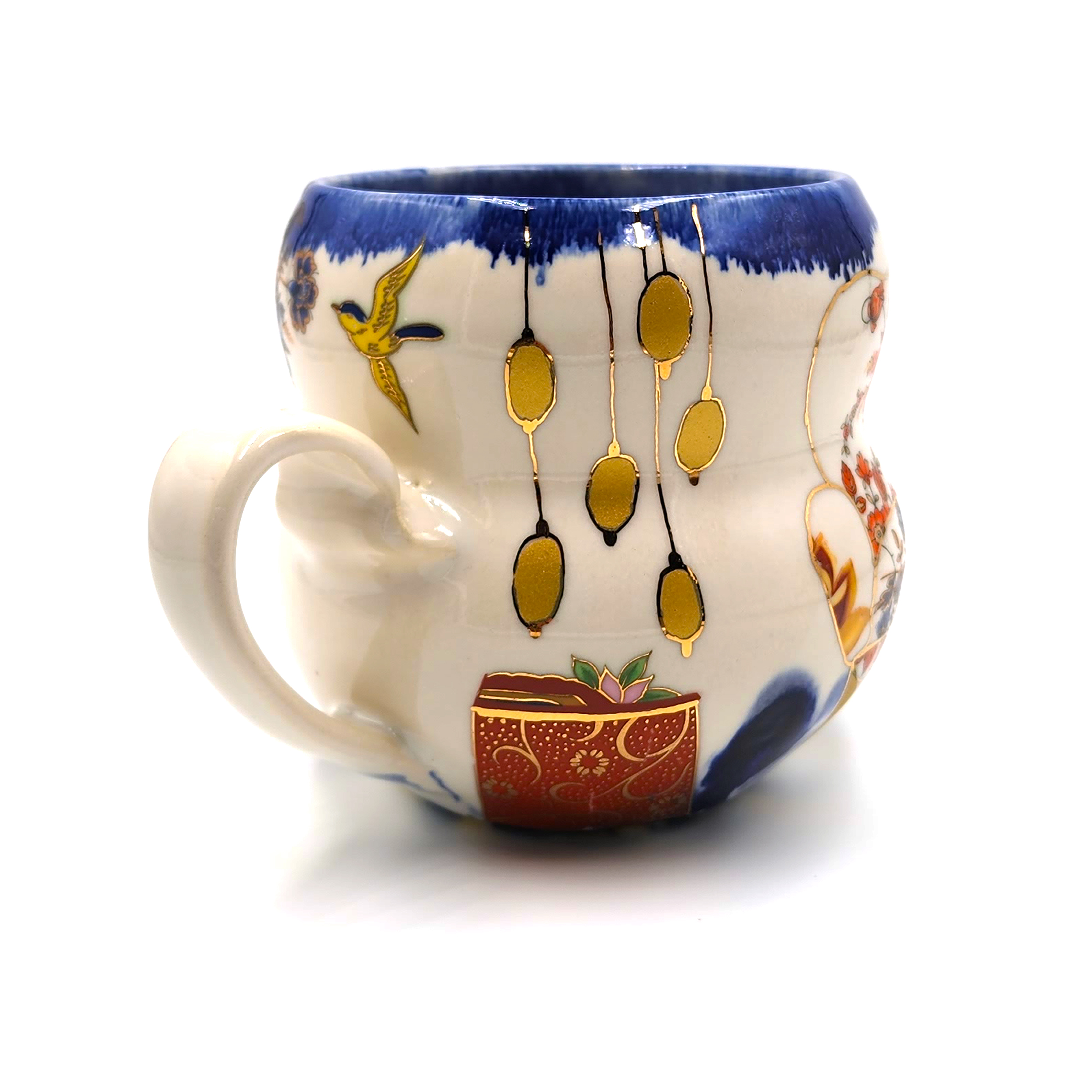 porcelain coffee mug, ceramic art, teacup with handle, hand-painted mug, wheel-thrown pottery, Japanese vase design, floral illustration, cozy home decor, decorative ceramics, underglaze transfers, overglaze decoration, metallic luster, vintage ceramic transfers, cone 6 oxidation, cone 018 firing, food safe mug, no microwave use, hand wash recommended, floral armchair motif, whimsical ceramic design, Melanie Sherman