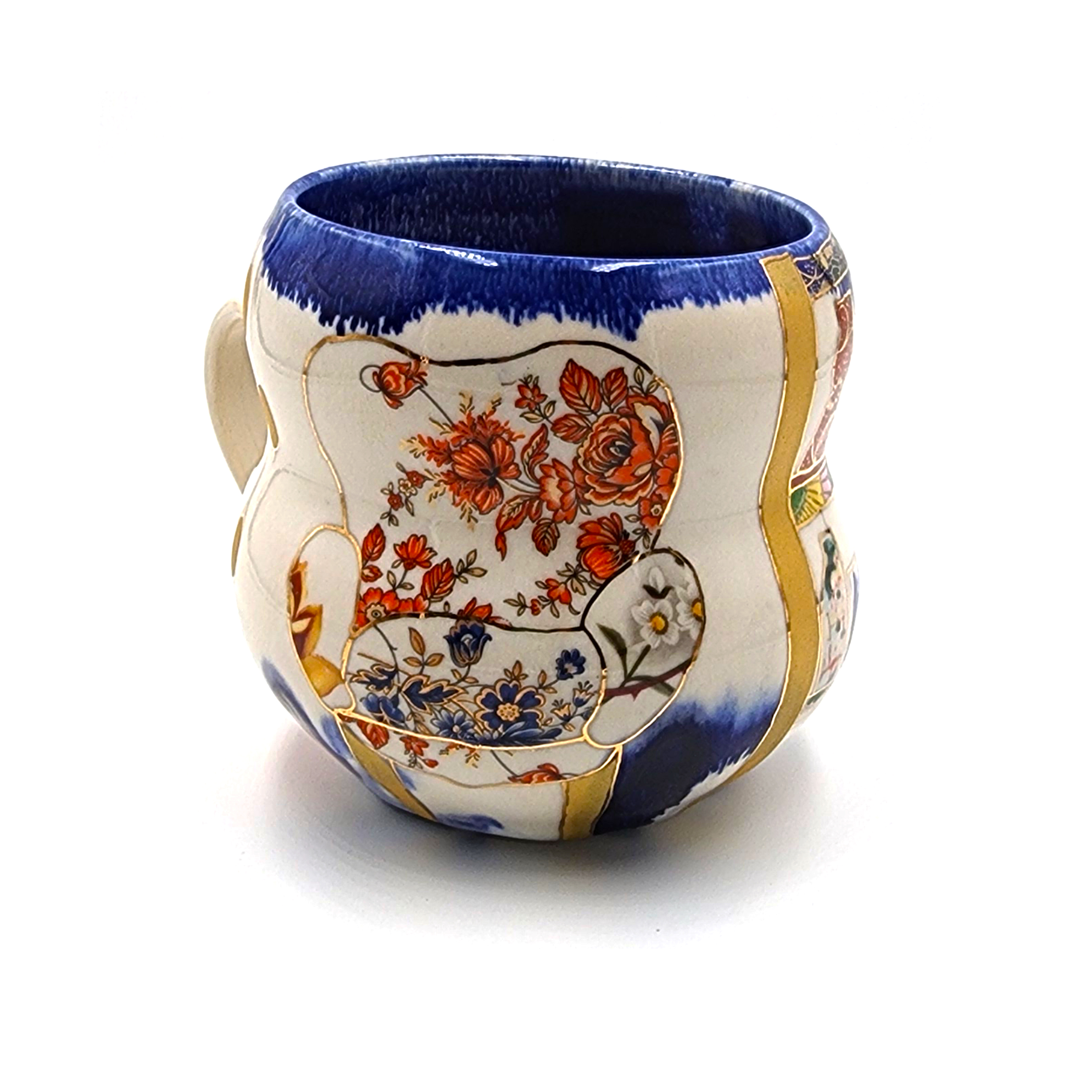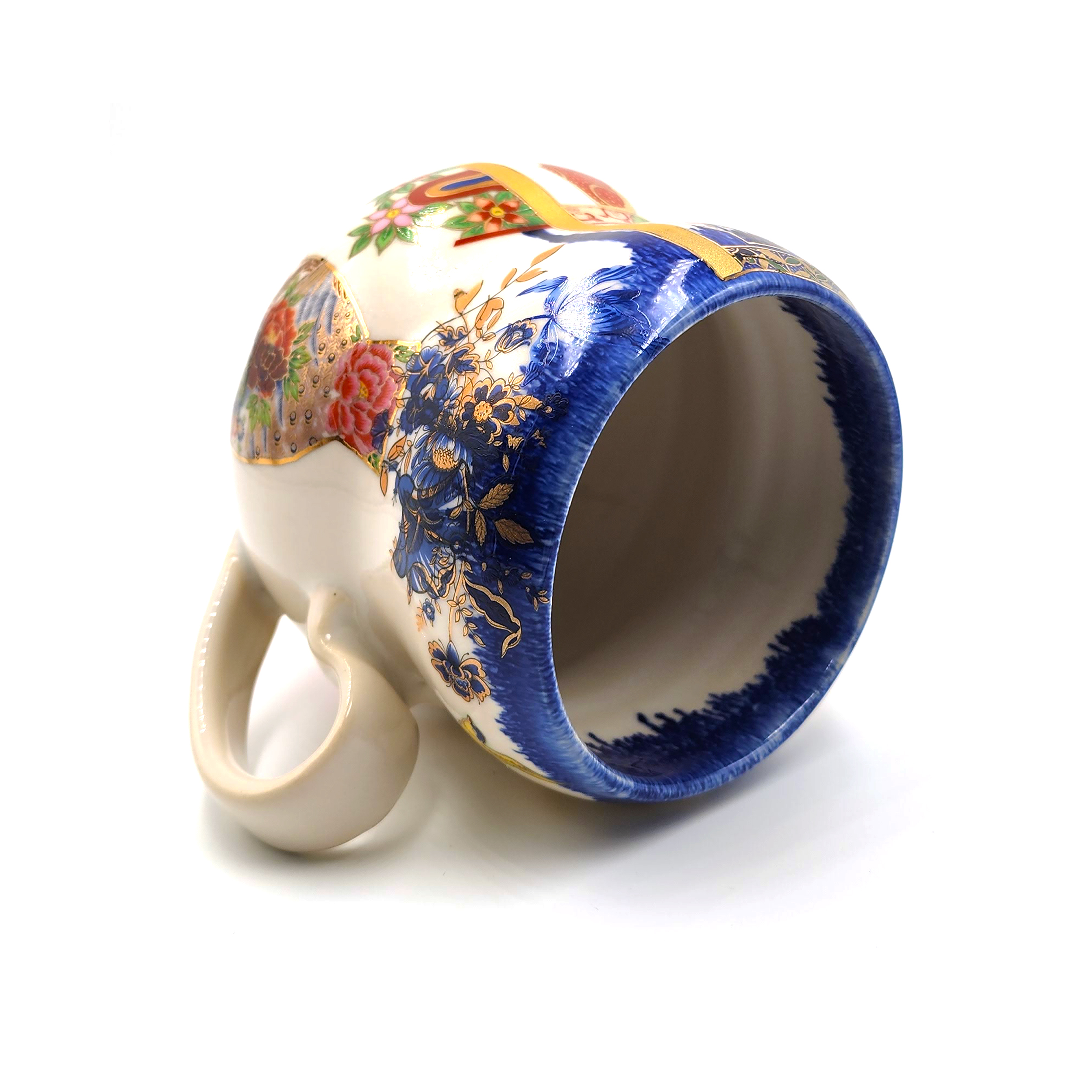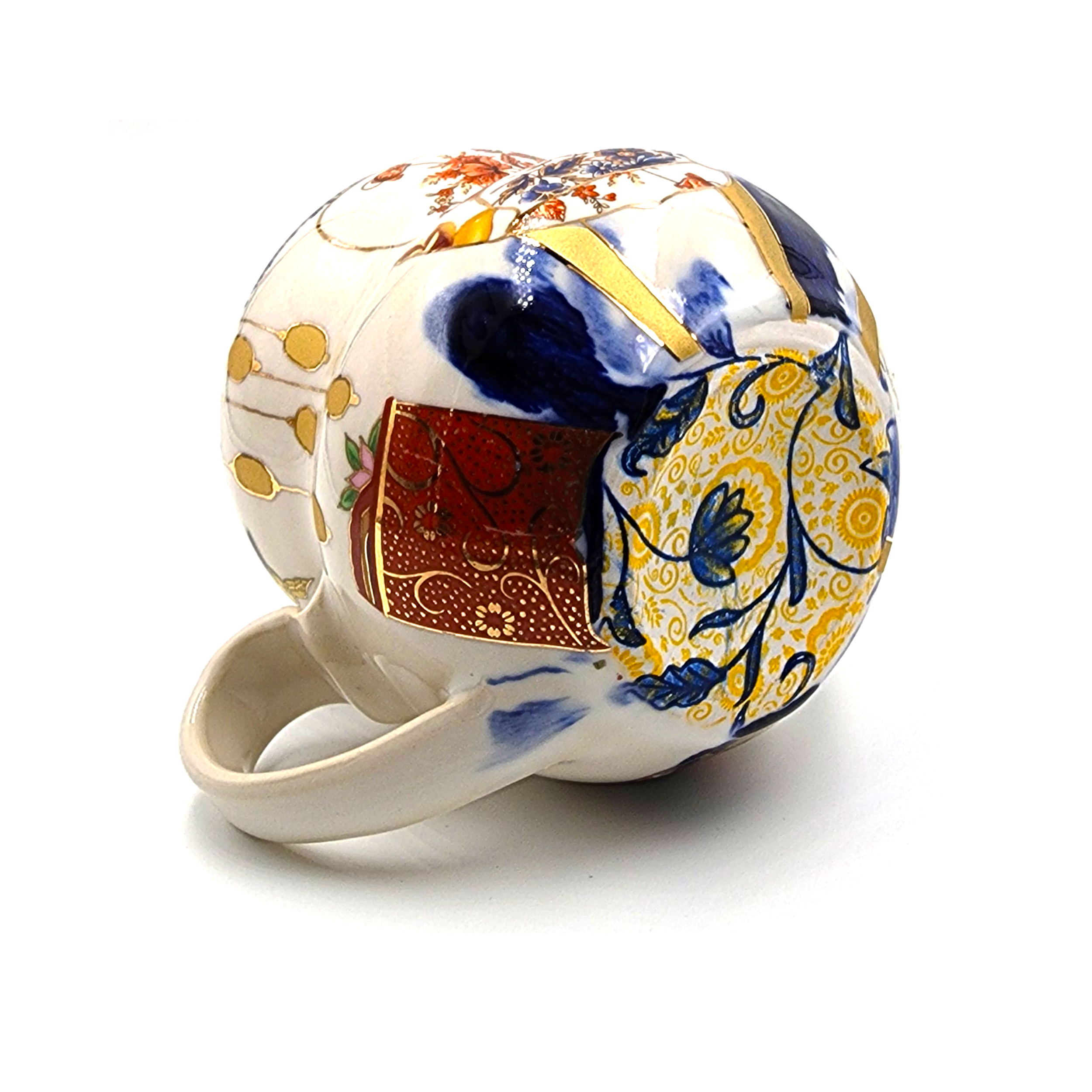 Each mug is wheel-thrown and hand-painted, using a layered combination of underglaze transfers, glaze, overglaze, metallic lusters, and vintage ceramic transfers. These diverse materials and techniques come together to create a richly detailed, visually striking surface that balances technical craftsmanship with whimsical storytelling.