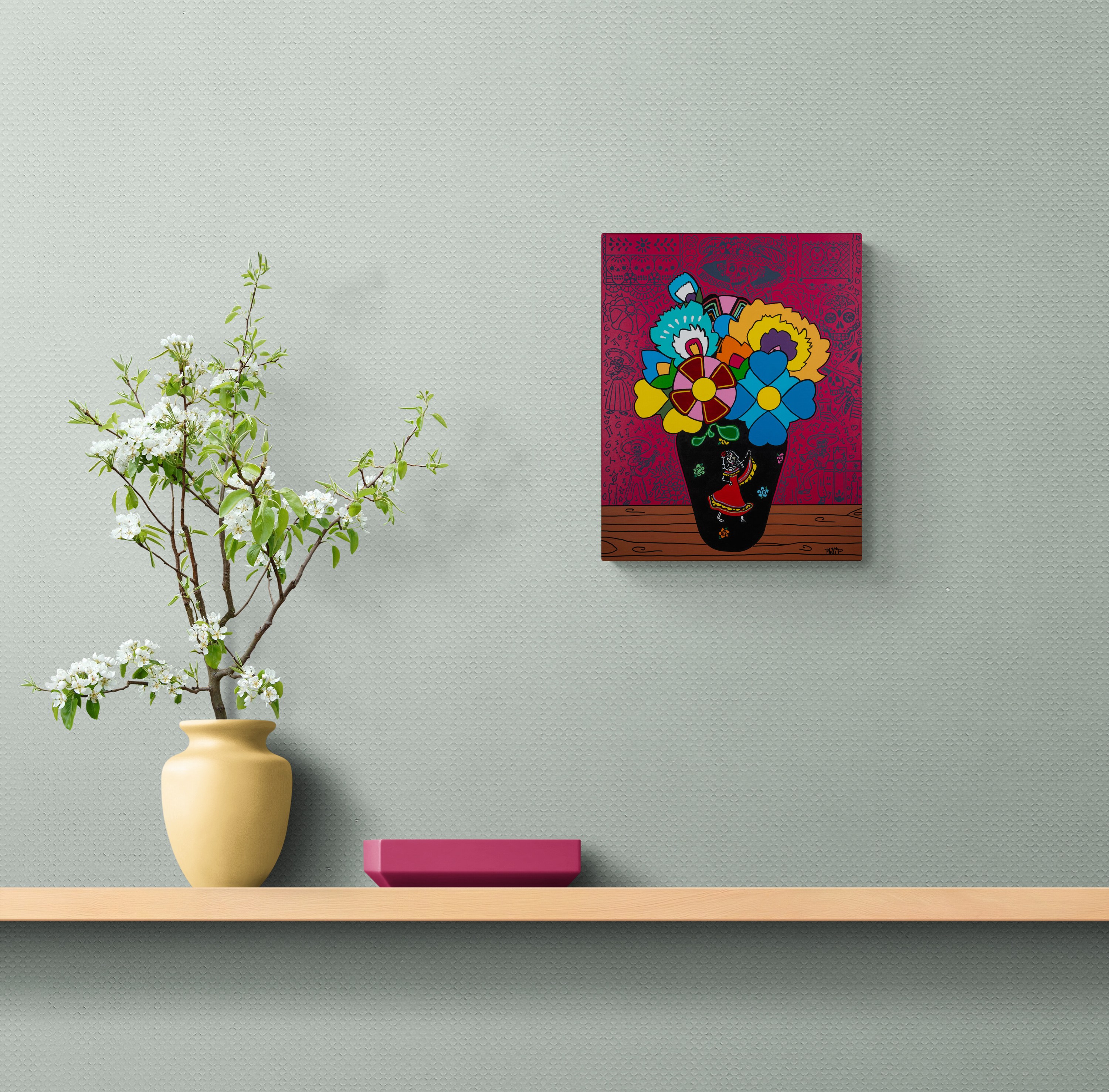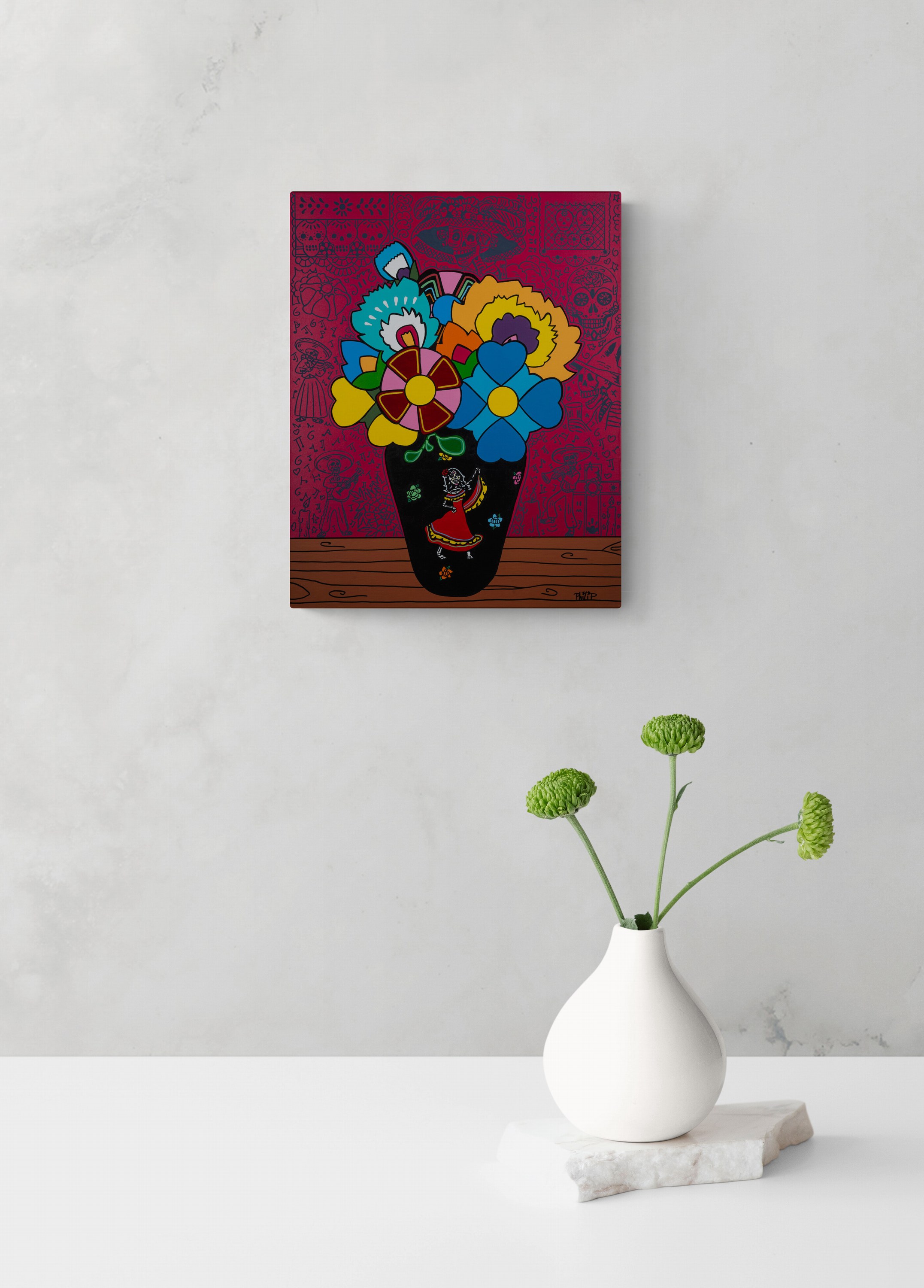 This painting is about Dia de los muertos. The flowers in the bouquet are based on Mexican folklore. The drawings are skeletons that dance, sing, show off and make music.