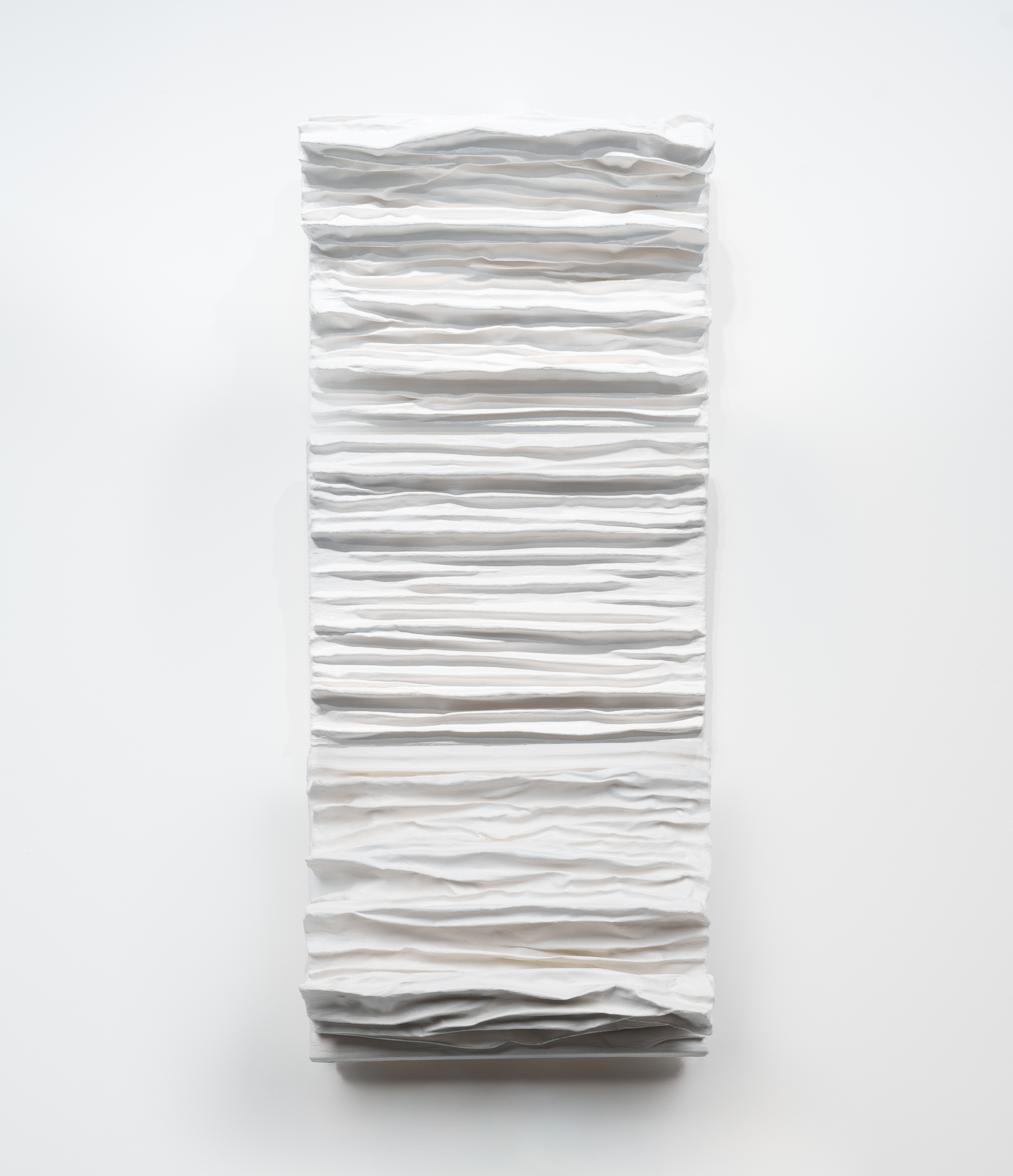 In his DIFFUSION SERIES of sculpted canvas, he explores the crescendo/buildup and diffusion/breakdown of energy to a restored, tranquil state. Altered transitional states of energy and variations that ultimately lead to a tranquil state of resolve allow the viewer to experience their own energetic narrative, often calming and meditative. Each narrative conveys universal energy to be in a constant state of change and evolving progression (referencing the constance of evolution and change within order and chaos)