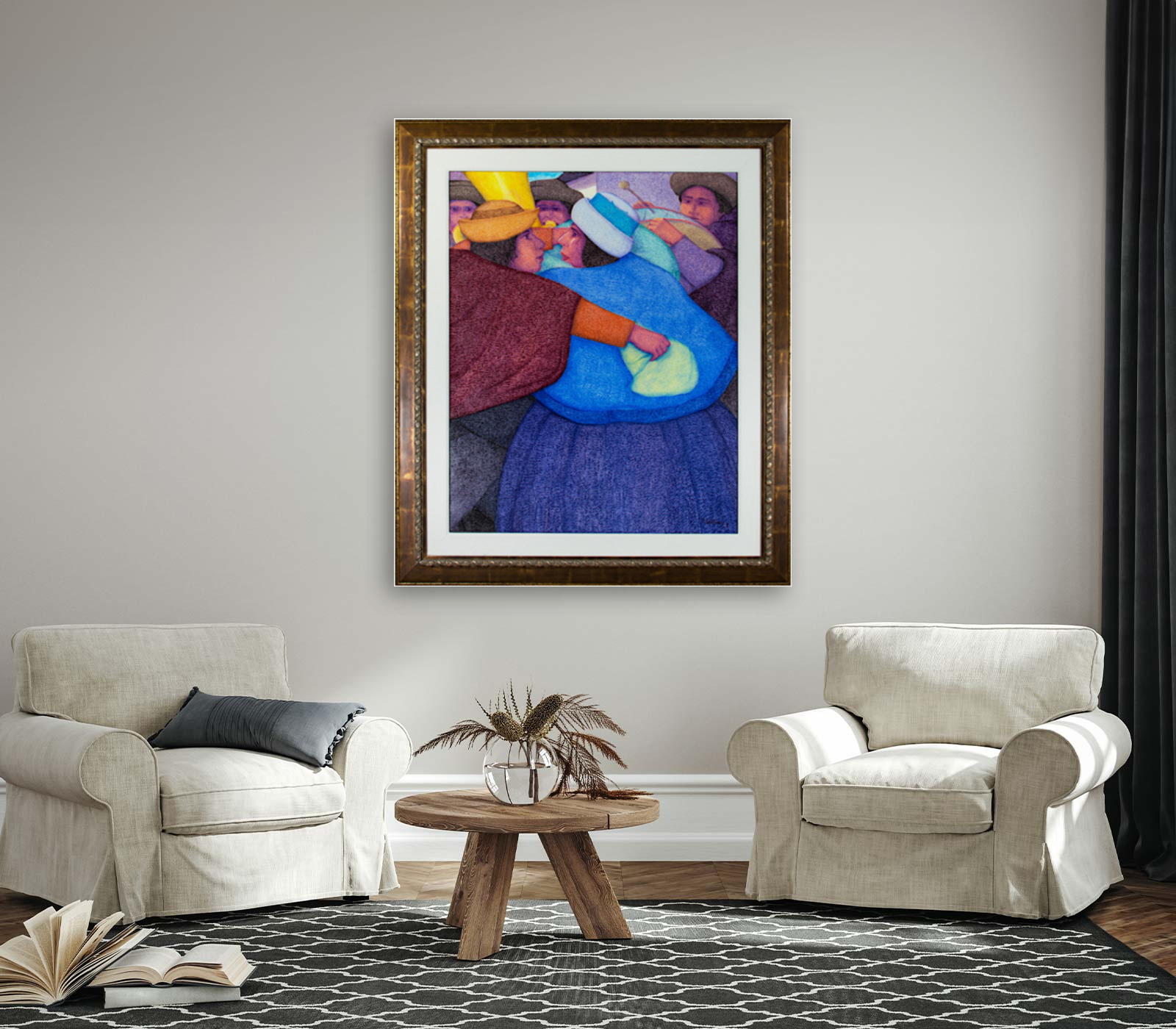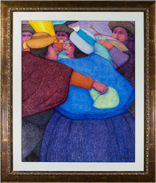A leading Peruvian artist, Ernesto Gutierrez, was born in Lima, Peru, in 1941. His father was a Spaniard and his mother was a descendant of the Inca. Upon completion of his high school education, Gutierrez entered the School of Fine Arts in Lima, Peru, he received a Bachelor of Fine Arts Degree in 1964 and was awarded a Gold Medal. Sponsored by the Brazilian government, Gutierrez received the Itamarti Scholarship and studied for two years (1966-67) at the Museum of Modern Art in Rio de Janeiro while extensively exhibiting his works throughout the art centers of South America: Rio de Janeiro, Sao Paulo, Cordova, Santiago de Chile, and Lima, among others. In 1971, Gutierrez was granted a Fulbright Scholarship and studied at the University of Wisconsin where he received a Master of Fine Arts Degree in 1974. Gutierrez has been influenced by both local and global artistic factors: pre-Columbian forms and native-popular Peruvian art and also by modern French masters such as Cezanne, Gaugin, and to some extent, Matisse. The boldness of Gutierrez's colors creates an almost sensual excitement: shocking pink, chartreuse, mauve, and the whole gamut of blues, purples, and greens, often underlined and emphasized by complementary colors. In some of his paintings, Gutierrez assumes a cubist-realist simplification of forms and volumes and a precise rendering of surfaces. Gutierrez's sensibility strikes the viewer as essentially Spanish, while his inspiration derives from his Inca heritage, Peruvian landscapes, and folklore.