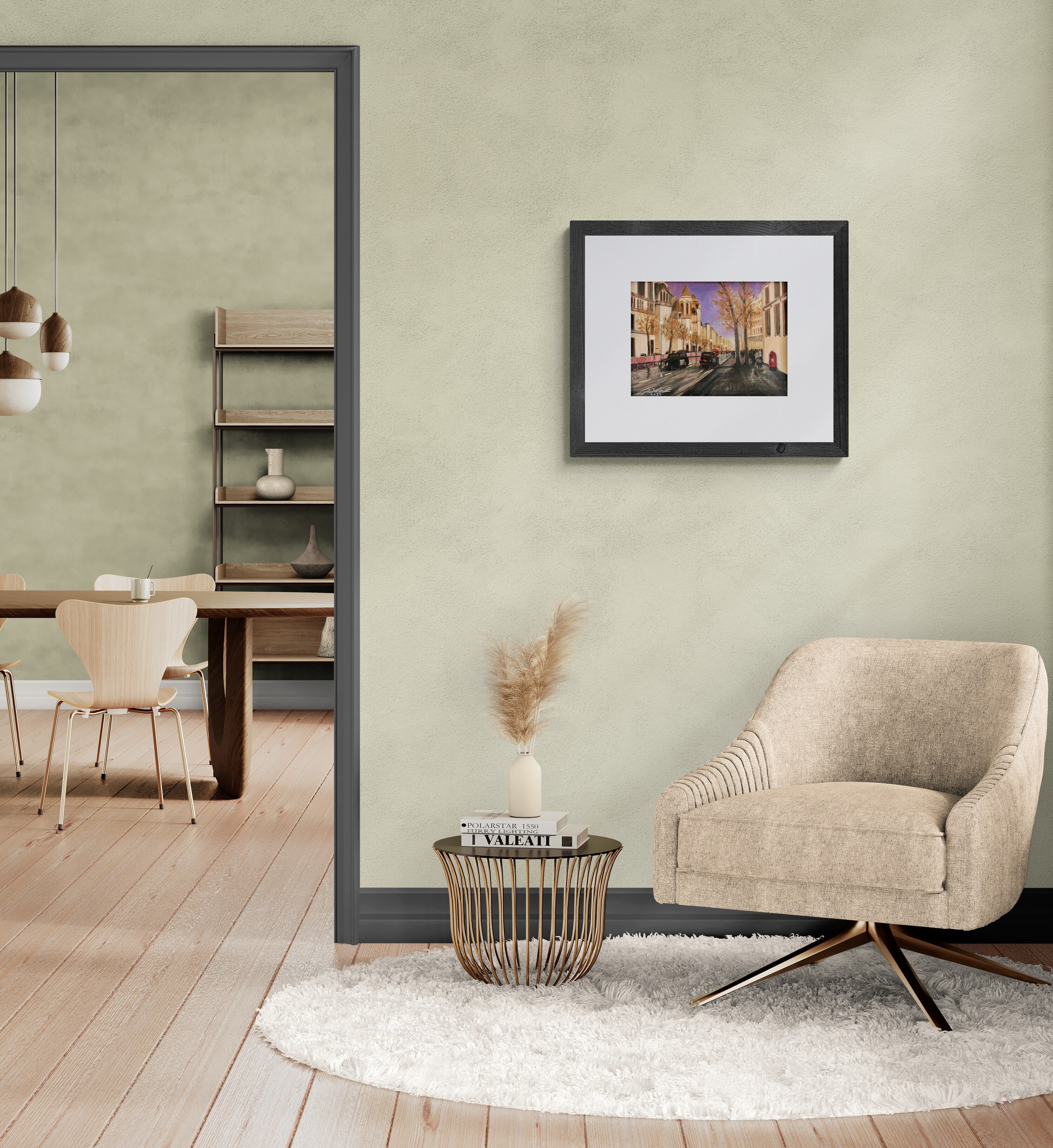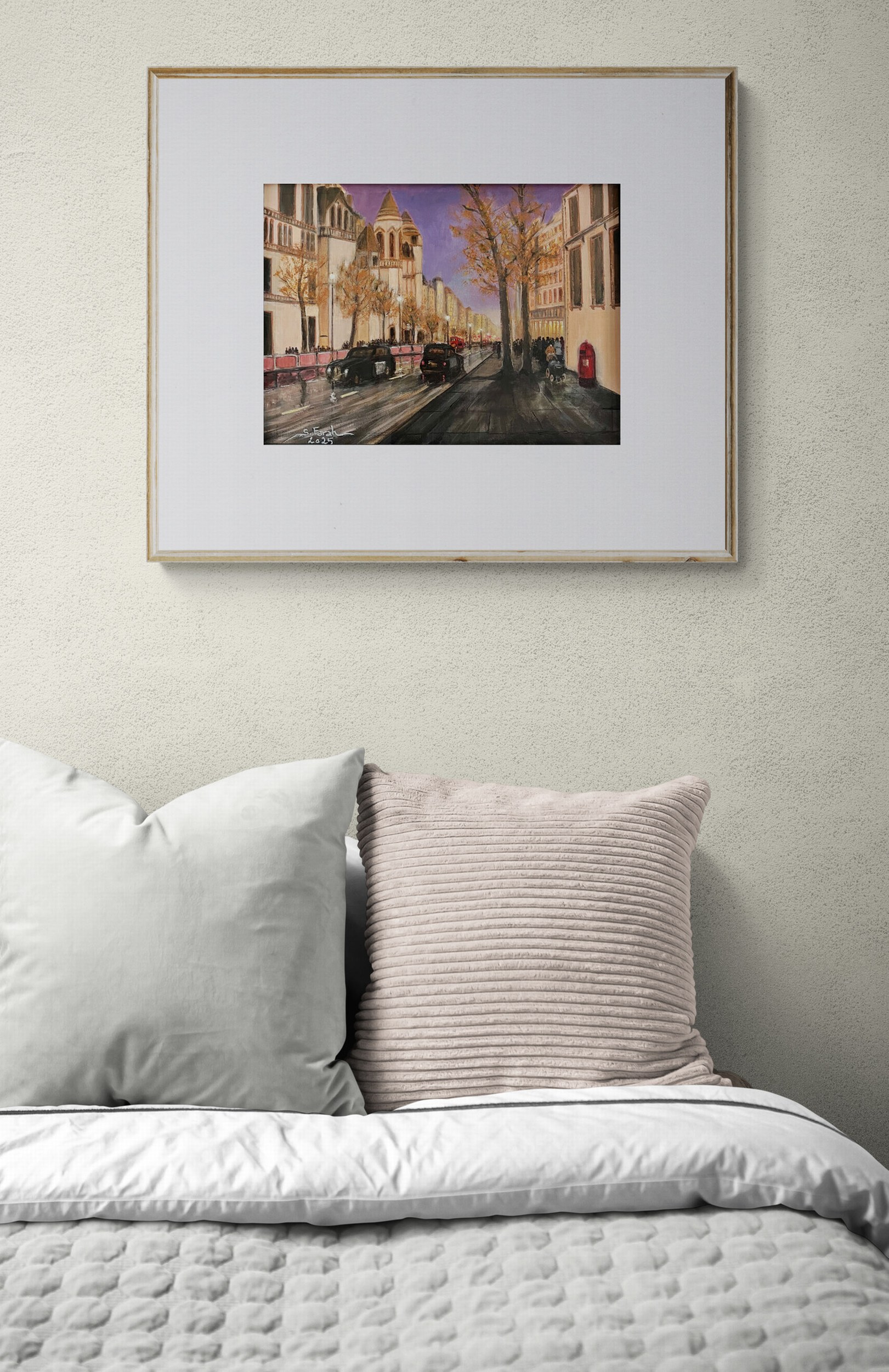 Working in acrylics, the artist masterfully balances movement and stillness, creating a composition that feels both alive and contemplative. The viewer is invited into the soft hum of the city as it winds down for the night, where reflections on rain-soaked pavement echo the mood of serenity and nostalgia.