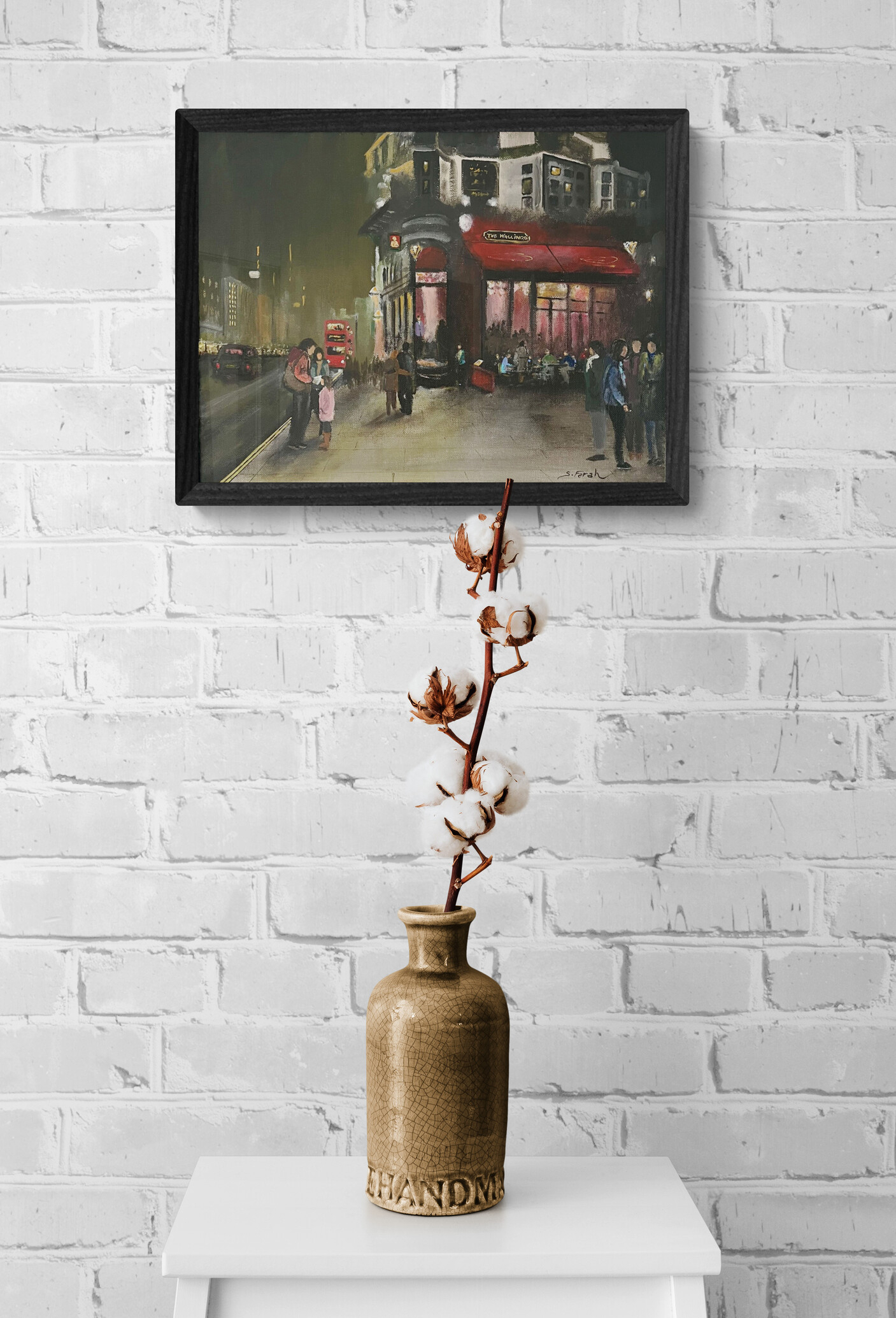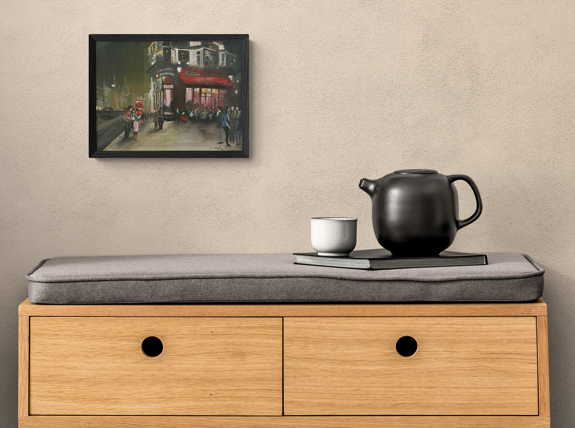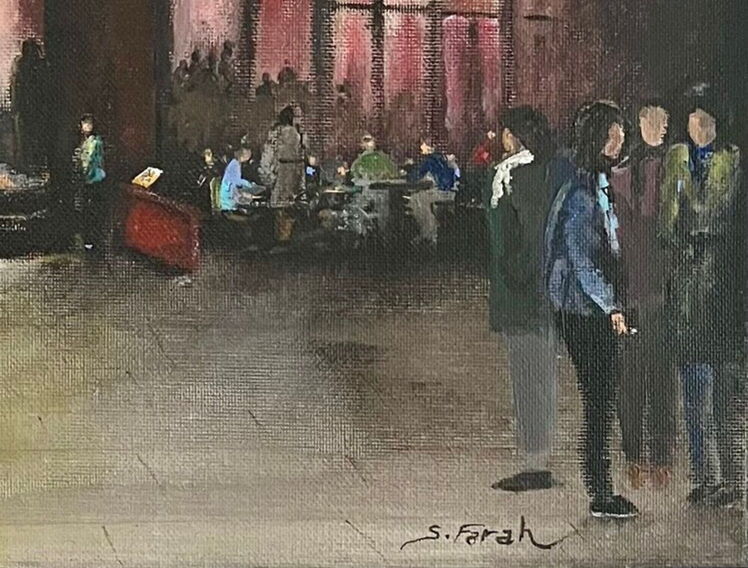 Samir Farah captures the warm glow and lively spirit of a London evening in this evocative painting. Depicting The Strand outside the iconic Wellington Pub, the view extends toward Charing Cross Station—an everyday scene imbued with familiarity and comfort. Farah’s work radiates cozy vibrancy and urban charm, celebrating the quiet magic found in ordinary moments.