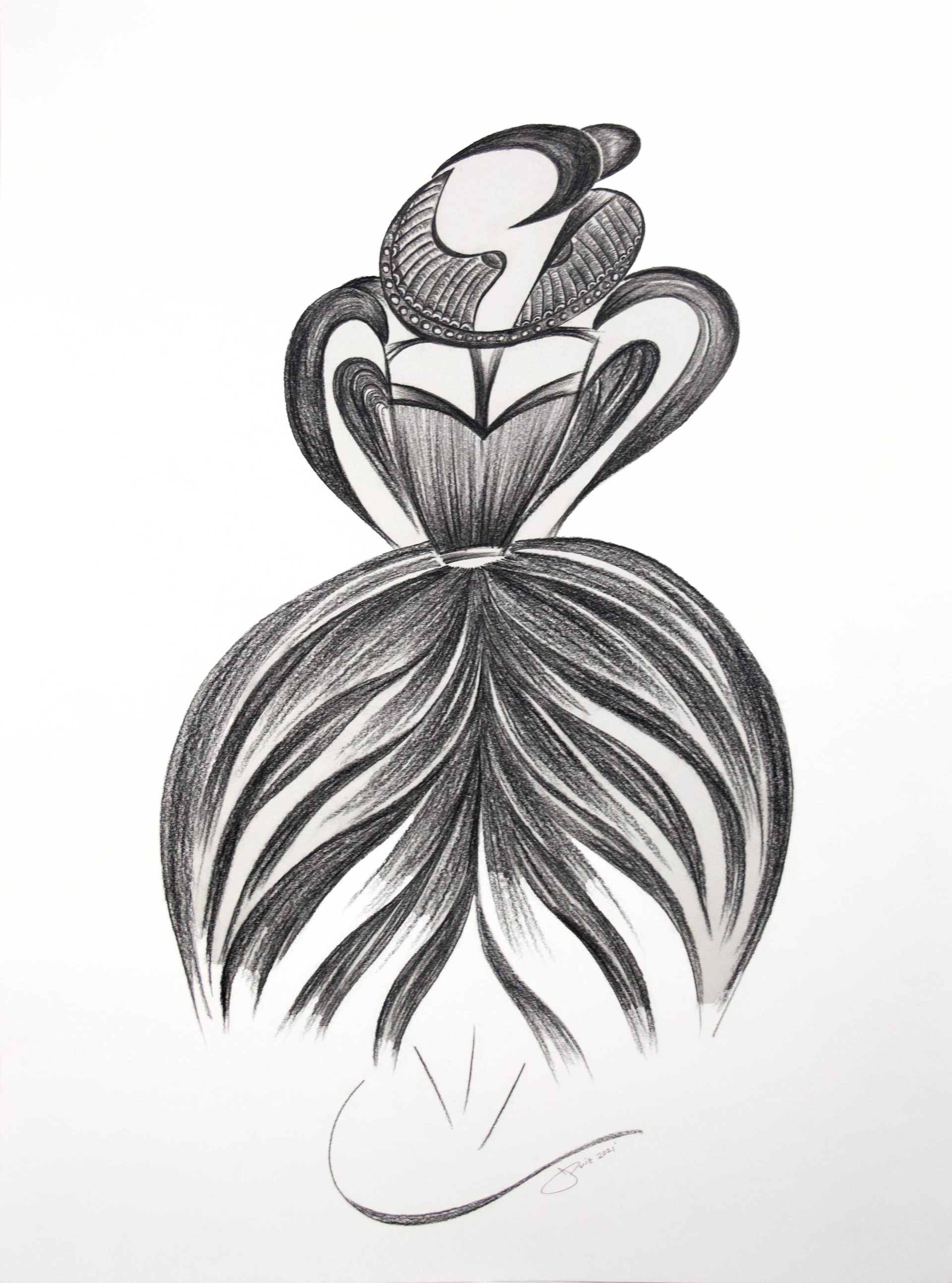 "Female 1540s Fashion Rendition" is an original drawing by the American artist Jorge Ruiz-Martinez. The artist works in an art deco style, imagining graceful figures in historic costume through that stylized lens. Art Deco architecture and graphic design took hold in the United States and Europe during the first part of the 20th century and came to be the iconic style of the metropolis and modernity. Ruiz-Martinez's drawings, though more stylized and simplified, recall the fashion images of Art Deco master Erté who likewise presented single elegant figures in resplendent costume. The artist signed and dated this work in the center lower right.