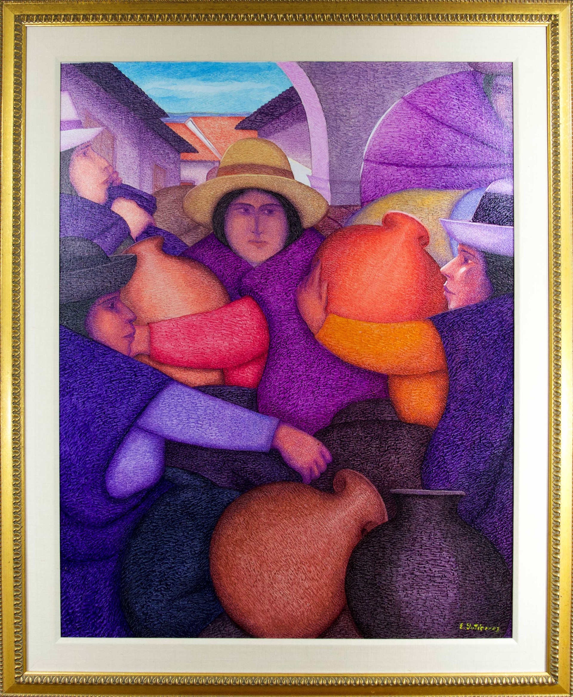 'Feria en Huancayo (Market in Huancayo)' is an original oil painting signed by the Peruvian-American painter Ernesto Gutierrez. The painting is an excellent example of the work that he was producing during the end of the 1990s. The composition shows a group of four Andean women closely clustered together. The rounded forms of their bodies and faces are repeated in the round forms of the ceramic vessels they carry to market. Indeed, the composition is unified by the repeating pattern of the figures, like the repeating motifs of a song, all of whom wear the same hat in their arrangement across the canvas. Paintings like this show the artist's observation of daily life on the streets of Peru, but at the same time elevate these figures with mystery and magic. Presented in a custom gold finish wood moulding and with a linen liner. The piece is signed in the lower right on the front of the piece. It is also titled in ink on the reverse of the canvas, in the upper left corner.