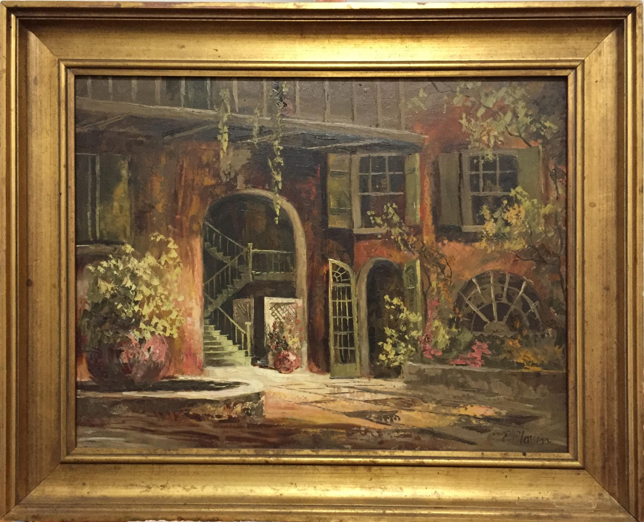 Classic French Quarter courtyard scene, comes ready to hang in a gilt frame. Dimensions given include frame.