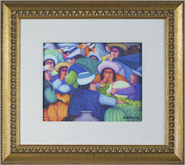 A leading Peruvian artist, Ernesto Gutierrez, was born in Lima, Peru, in 1941. His father was a Spaniard and his mother was a descendant of the Inca. Upon completion of his high school education, Gutierrez entered the School of Fine Arts in Lima, Peru, he received a Bachelor of Fine Arts Degree in 1964 and was awarded a Gold Medal. Sponsored by the Brazilian government, Gutierrez received the Itamarti Scholarship and studied for two years (1966-67) at the Museum of Modern Art in Rio de Janeiro while extensively exhibiting his works throughout the art centers of South America: Rio de Janeiro, Sao Paulo, Cordova, Santiago de Chile, and Lima, among others. In 1971, Gutierrez was granted a Fulbright Scholarship and studied at the University of Wisconsin where he received a Master of Fine Arts Degree in 1974. Gutierrez has been influenced by both local and global artistic factors: pre-Columbian forms and native-popular Peruvian art and also by modern French masters such as Cezanne, Gaugin, and to some extent, Matisse. The boldness of Gutierrez's colors creates an almost sensual excitement: shocking pink, chartreuse, mauve, and the whole gamut of blues, purples, and greens, often underlined and emphasized by complementary colors. In some of his paintings, Gutierrez assumes a cubist-realist simplification of forms and volumes and a precise rendering of surfaces. Gutierrez's sensibility strikes the viewer as essentially Spanish, while his inspiration derives from his Inca heritage, Peruvian landscapes, and folklore.