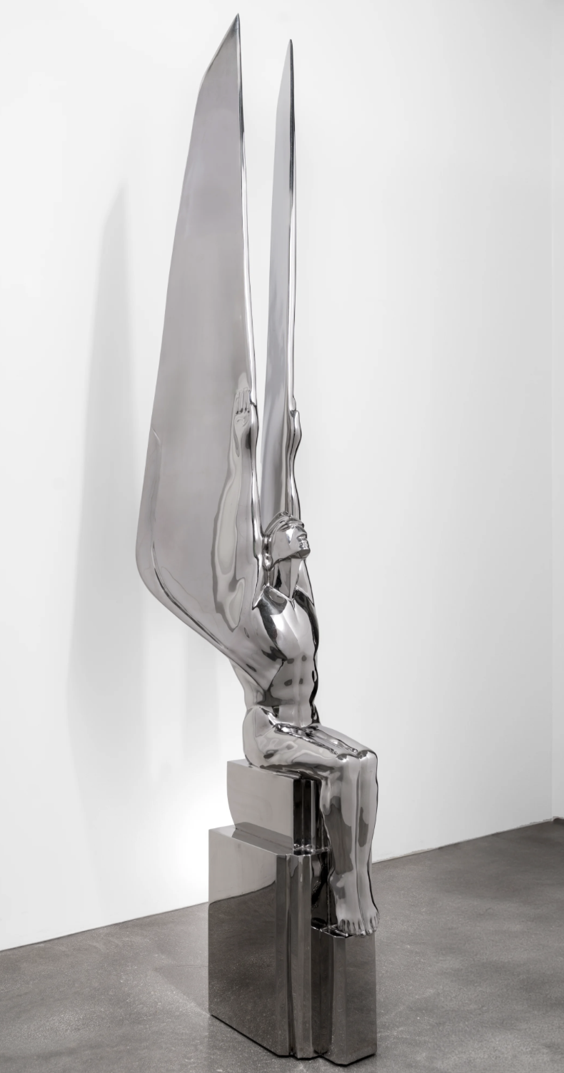 The sleek, reflective surface of the piece suggests a synthesis of technology and human form, resonating with the prophecy of the Eagle and the Condor. The rigid, industrial nature of the sculpture aligns with the Eagle’s representation of science, industry, and masculine energy. However, the figure’s poised, almost meditative posture hints at balance, possibly alluding to the prophesized reunion between the Eagle and the Condor. This visual contrast embodies the prophecy’s central message—humanity's need to reconcile intellect and intuition, technology and nature, to enter an era of harmony and spiritual awakening.