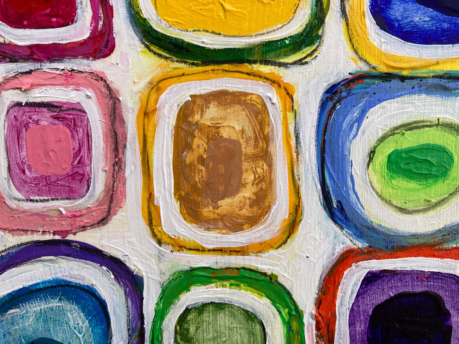 Artist’s Statement: “As I often do, I chose a very simple form to work with here – a grid of rectangles. Content never interests me much, and I don’t spend time thinking about it. I’m interested in the balance of assonant and dissonant colors, line quality, texture and impasto, push and pull, these sorts of issues. This series was mostly sold in New Orleans, but I pulled various ones out of the series to show only online, so that collectors of my work elsewhere and new folks get a chance at them." Lacquer, Charcoal, House Paint, and Acrylic.