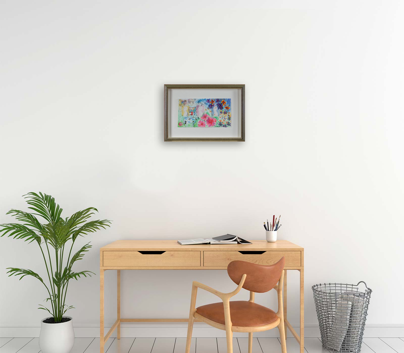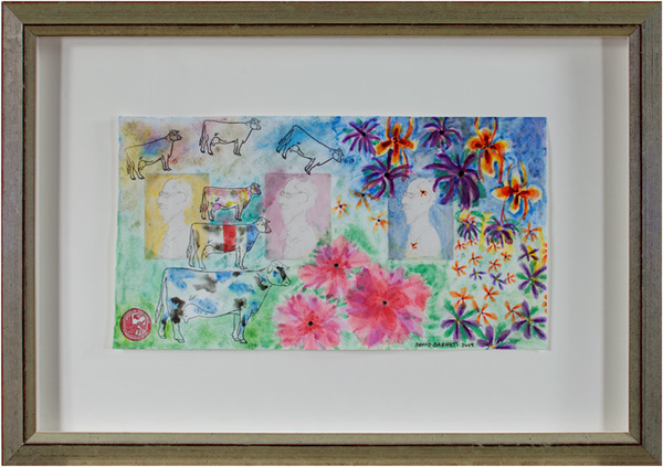 Materials: Mixed media: watercolor, ink, rubber stamp and iridescent acrylic signed and dated lower right