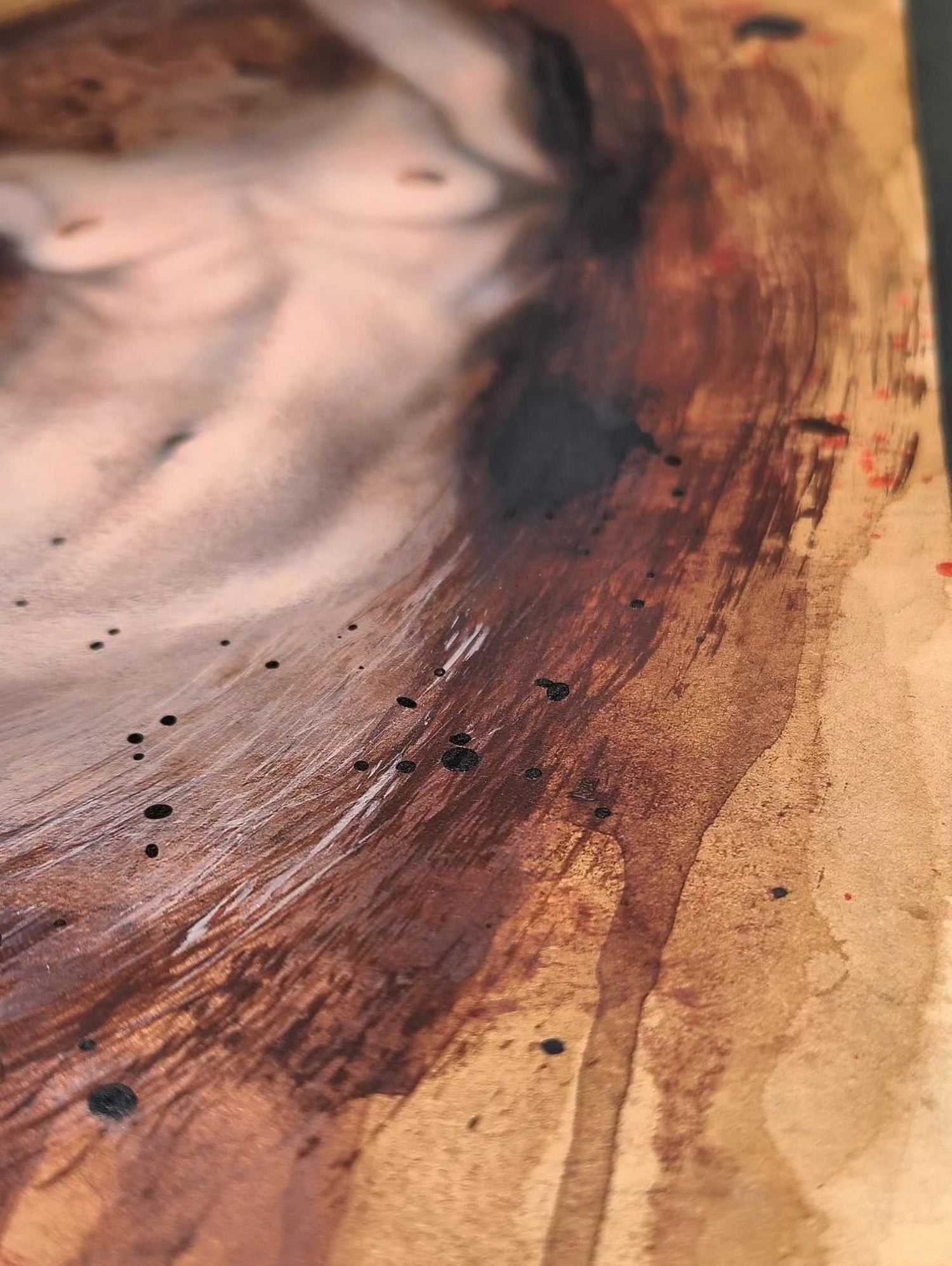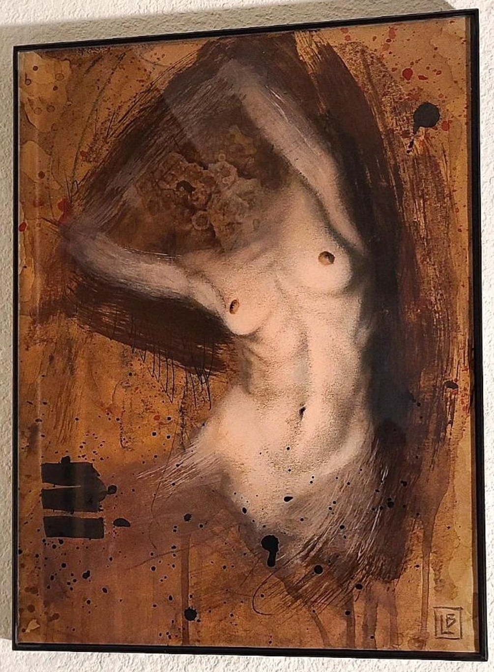Louis Braquet is a top-selling artist in New Orleans, and as his paintings sell out quickly at the Royal Street gallery that represents him we are thrilled to have been chosen to show his work here on 1stDibs, giving our customers a shot at them as they are produced. Braquet is a native New Orleanian who attended the prestigious New Orleans Center for Creative Arts (NOCCA) in his youth, where he began his rigorous training by replicating paintings by masters such as DaVinci, Caravaggio, Bosch, and Delacroix. This traditional discipline, ignored by most of today’s artists, is obvious in his old-world craftsmanship. He works with a range of media including acrylic, oil, ink, charcoal, and graphite. This painting was made with acrylic paint over fixed conte, charcoal, and ink on coffee-stained heavyweight 140 lb. hot press Arches brand watercolor paper, framed behind glass and ready to hang. It measures 9 x 12.