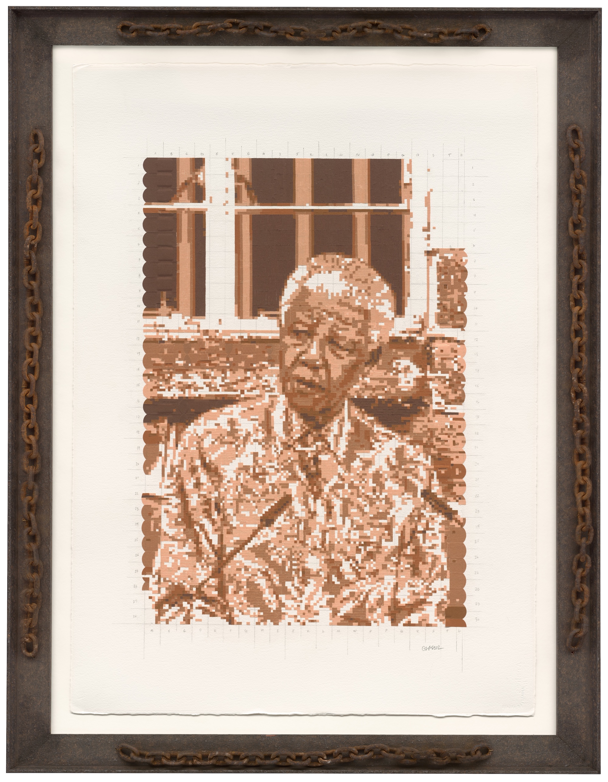 The photo Glaser used as reference pictures Mandela giving a press conference standing in front of the cell he spent 27 years of his life in.