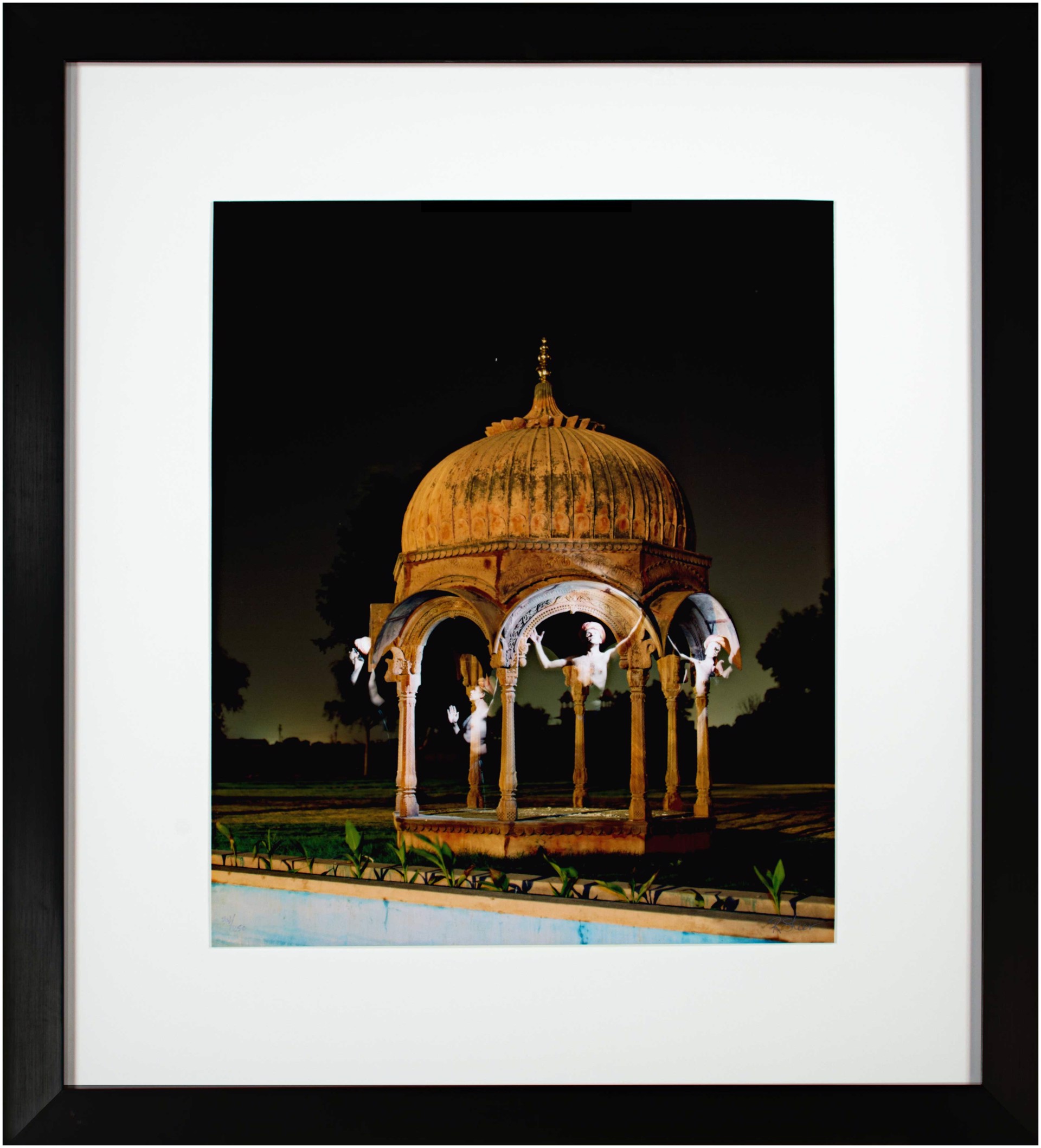 "India Spirits" is a photographic performance piece by Robert Kawika Sheer, signed lower right and numbered lower left 34/250. The image depicts a shrine in Rajasthan, “city of kings,” composed of a large circular dome resting on eight arches. In the space beneath the four arches nearest to the viewer, turbaned floating “spirits” appear, reaching toward the top of the arches. They are lit against the green-black night sky and contrast with the copper-colored shrine.