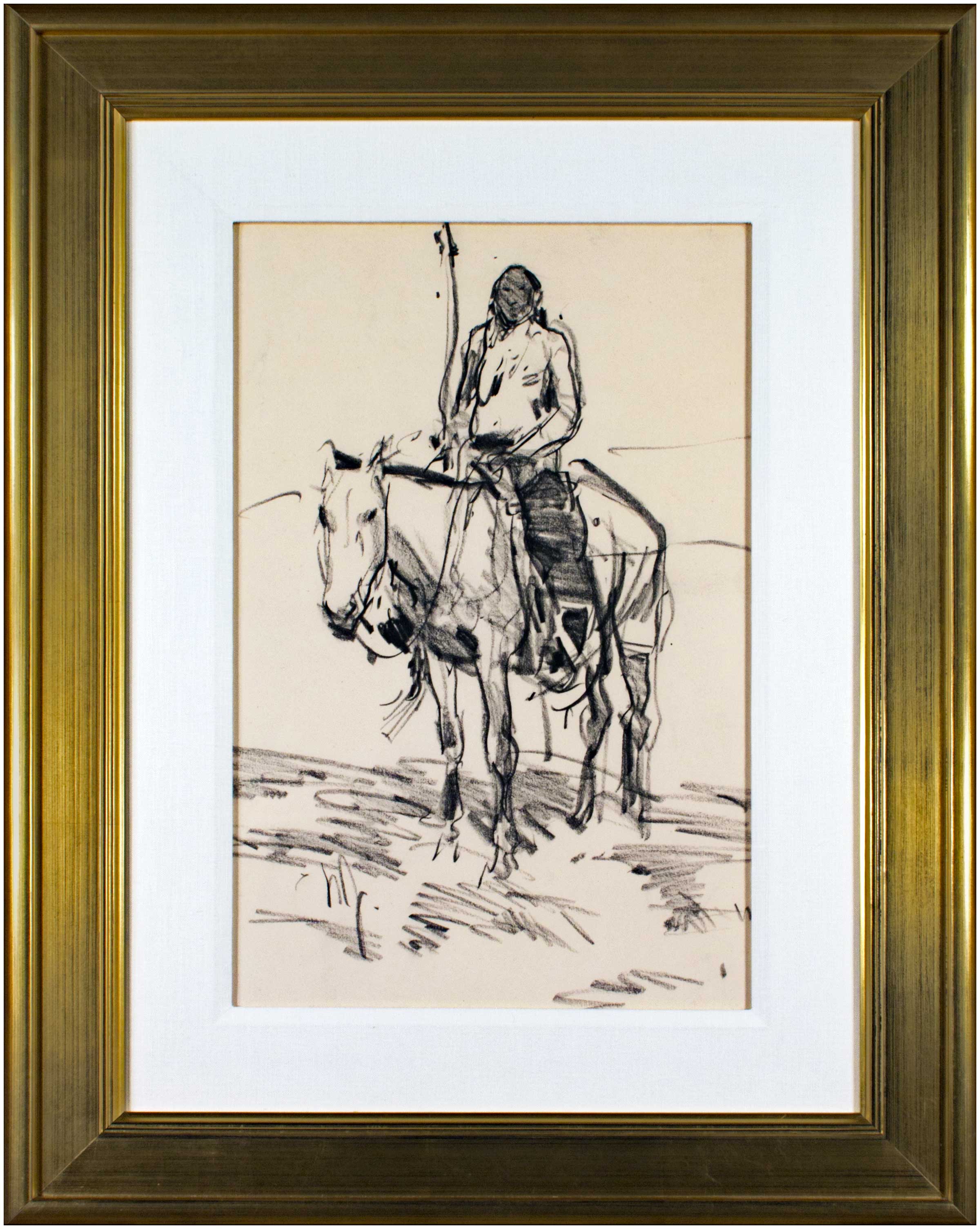A painter of the Westerner today, particularly Indians, Jacob was born in Elizabethton, Tennessee in 1938 and has been living in Denver since 1966. My goal in drawing,he states,is to describe the subject accurately and expressively with a minimum of means. I work quickly. I have a strong tendency to put things down simply. I just can’t seem to work slow. A dealer described his technique as Ned draws the way other people talk. A painter asserted that Jacob’s work makes a strong first impression. He hits you as hard as he can. After growing up in New Jersey, Jacob hitchhiked to Montana with $50 and a high school diploma. He had worked as a guide and as a trading post clerk when he met the painter Ace Powell who taught him art fundamentals. Without funds, Jacob lived with the Blackfeet until he hitched to Taos in 1961 because he was impressed with Nicolai Fechin’s colors. Bettina Steinke taught him drawing, A.D. Greer advised on colors, Robert Lougheed took him on field trips, and a circle of other young painters offered support. By 1966, Jacob’s skills had matured. His practice in painting is to make a small color sketch for each work because If it’s a small painting and you find a problem, it’s a small problem. In Denver, friends gather in Jacob’s loft where he says, I’m the mouthpeice. He has gone to Spain, Russia, Morocco, and the South Seas to study and sketch and been featured in American Artist, and twice in Persimmon Hill and Southwest Art. Elected to membership in both the Cowboy Artists of America and the National Academy of Western Art, he quit both because he doesn’t believe in competition with his peers. Resource: Contemporary Western Artists, by Peggy and Harold Samuels 1982, Judd’s Inc., Washington, D.C.