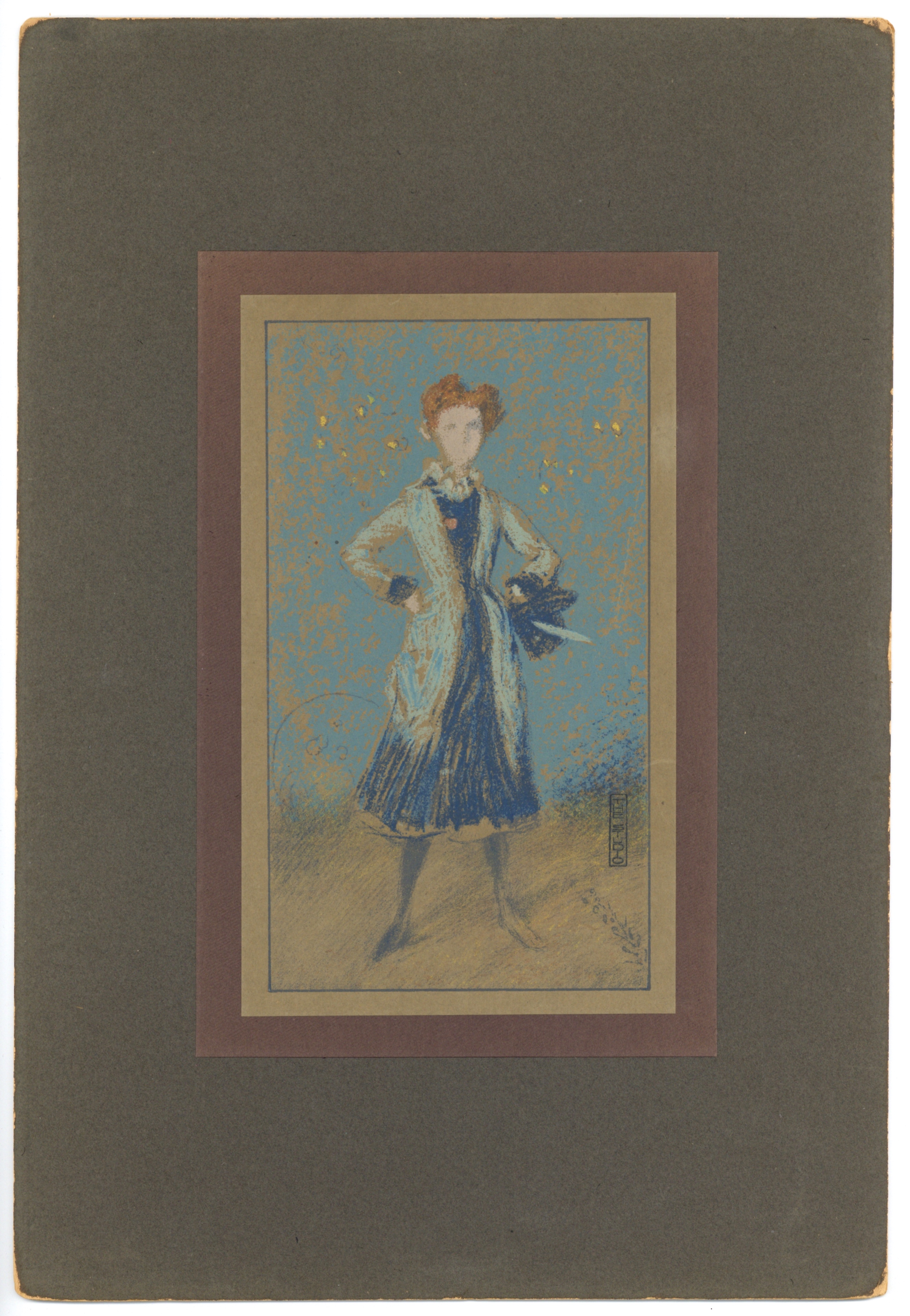 Medium: lithograph (after the pastel). The lithography was executed by Whistler's friend and fellow artist Thomas Way, and published in London by The Studio in 1905 for a rare deluxe portfolio. Printed on smooth wove paper, the lithograph measures 8 3/4 x 5 1/4 inches (222 x 134 mm). The lithograph is presented as originally published: mounted along the top edge onto a brown backing sheet, which is itself mounted onto a stiff antique paperboard. Not signed.