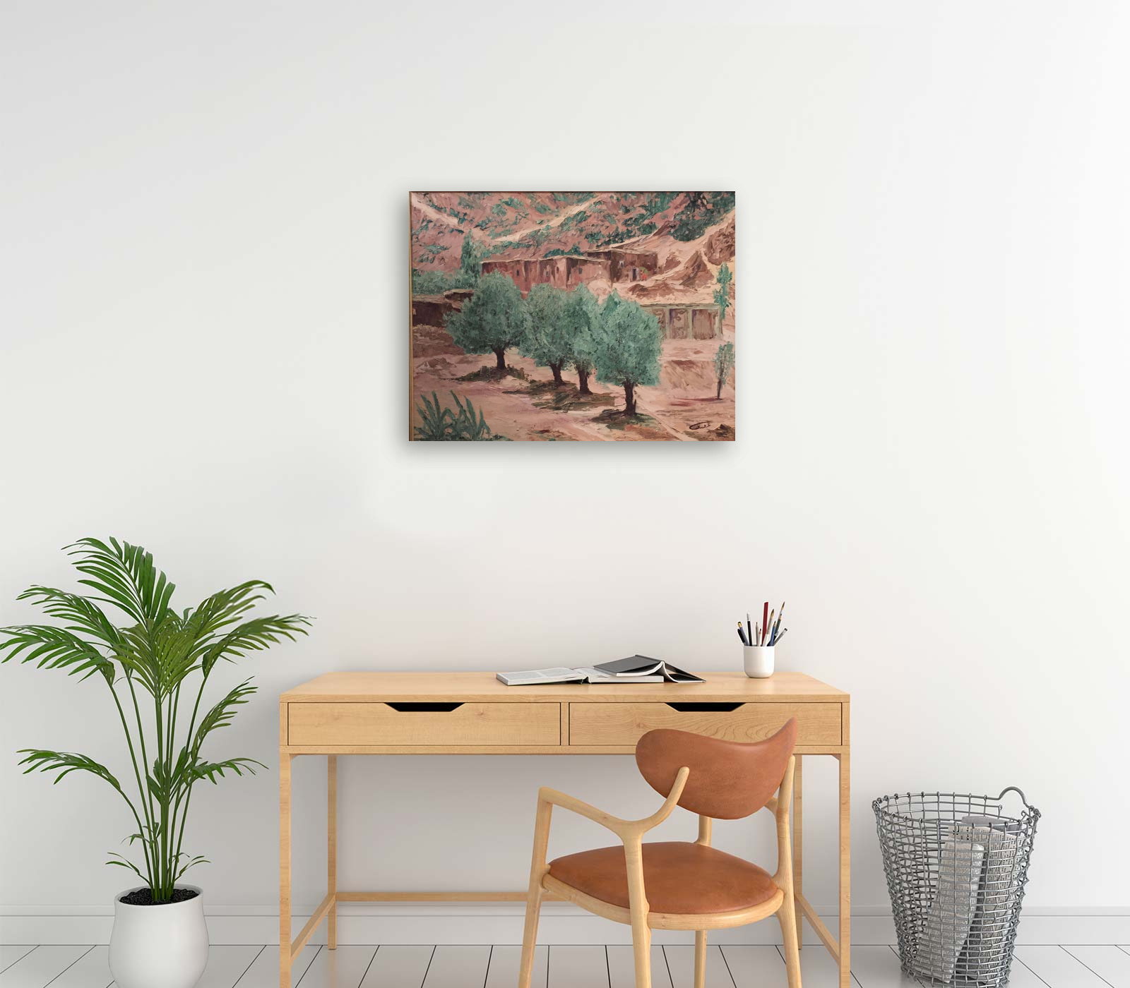 A nice customer who reads a bit of Arabic filled me in that the full name of the artist is Afif Benanni. The title of the painting refers to "the olive trees of l'Ouka," yet I can't find a town by that name in Morocco. Hmmm. At any rate: it's all about the painting anyway, right? -- a pretty scene that we're guessing is in Morocco, showing a quaint, arid mountain village with sparing greenery -- and you can see one of the olive farmers there by the entrance to her home. The extremely simple palette of earth tone colors adds to the allure of this painting. Measures 27" x 33" with frame, 20" x 26" without.