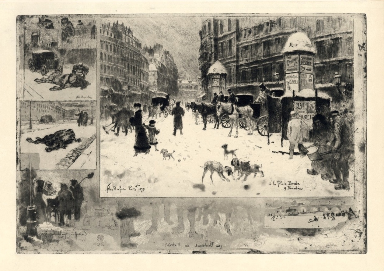 Félix Buhot (1847-1898) was a French painter and illustrator. He is credited with reviving 17th-century etching techniques in late 19th-century art. He depicted city views and seascapes, and often displayed the effects of weather such as rain, snow and fog. He got inspiration from Montmartre in Paris, His works were also published in periodicals and books, and he became popular in the United States.