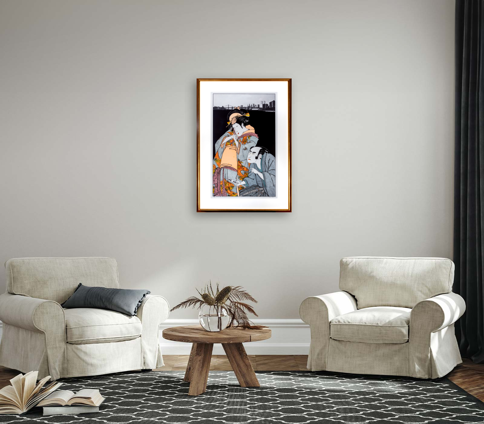 "Love Letter, After Kunimasa" is a hand-painted lithograph by Michael Knigin. It is signed in the lower right and is edition 16/200. This print is inspired by the Ukiyo-e prints of Utagawa Kunimasa. This piece is archivally framed to museum standards with acid free foamboard, museum glass, and housed in a thin gold finished frame. Artwork Size: 32" x 19" Frame Size: 41 3/4" x 28 1/8"
