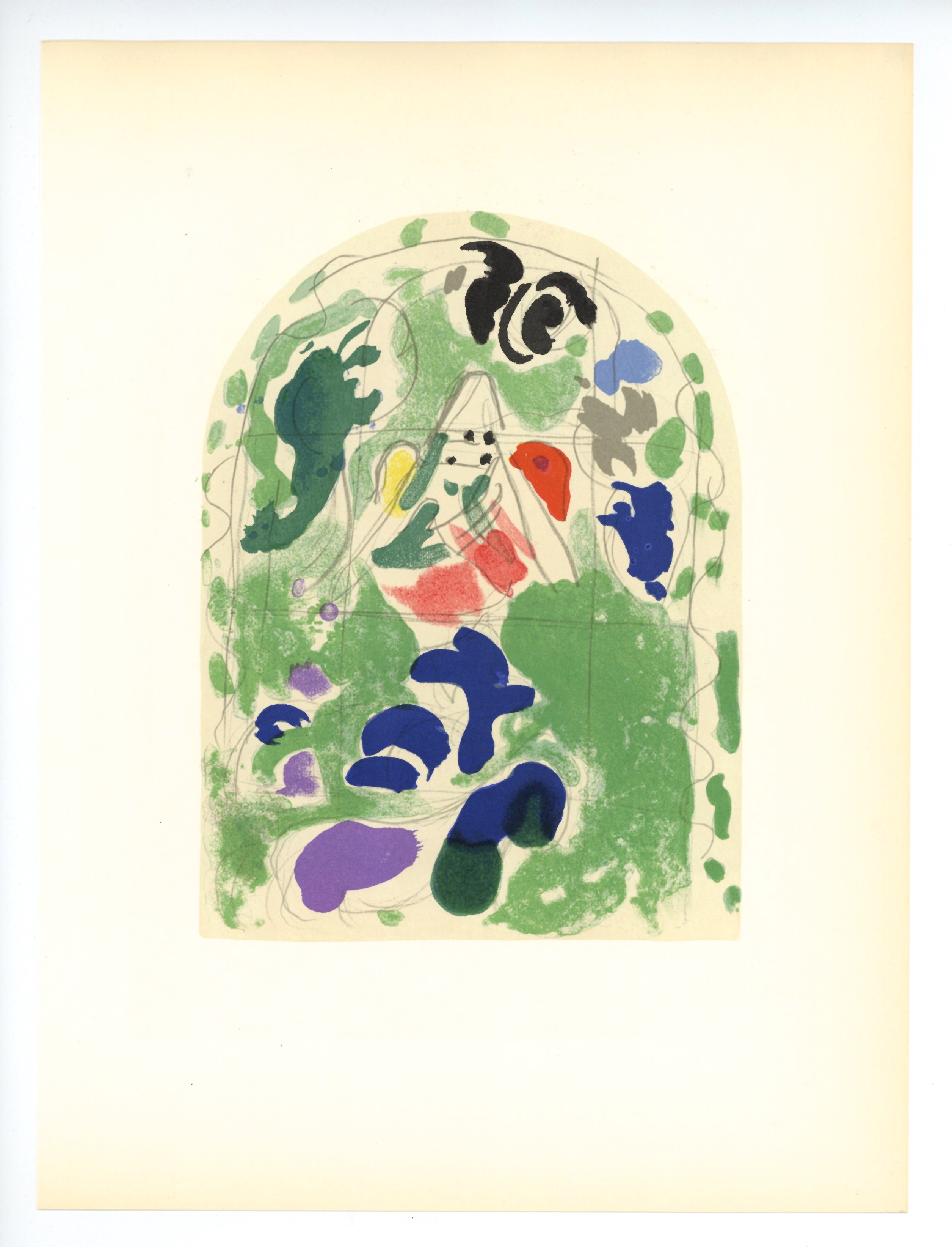 Medium: 12 lithographs (after the watercolors). A beautiful collection of lithographs, printed in 1962 at the Mourlot atelier for "Jerusalem Windows". These were executed by Chagall in preparation for his famous stained-glass windows for the Synagogue at the Hadassah-Hebrew University Medical Center in the Judaean Hills, and he created a different composition for each of the Twelve Tribes of Israel. Image size (each): 8 x 6 inches (203 x 150 mm). Sheet size (each): 12 3/4 x 9 1/2 inches (325 x 243 mm). There is a different lithograph printed on the back of each, as published. Not signed