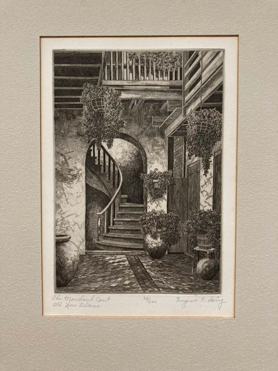 A signed etching by the justifiably famous New Orleans French Quarter artist Eugene Loving, in an edition of 200. It depicts in wonderful detail one of the notable courtyards of the French Quarter, the Marchand Courtyard. Loving was born in Texas, but was charmed by New Orleans and the French Quarter in particular, back when it was a bedraggled hangout for bums and bohemians. Print measures 10 x 7; and is matted in a beveled cream-colored mat.