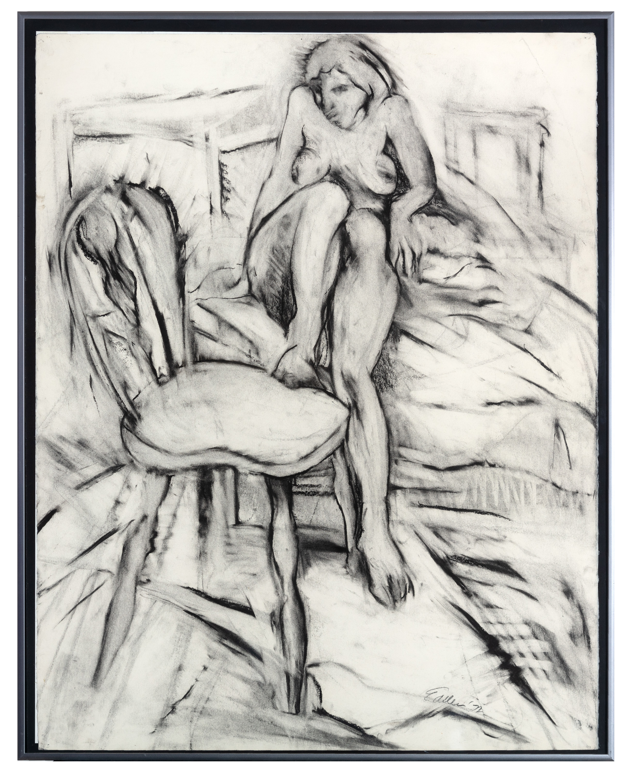 "Nude, with Foot on Chair" is a charcoal figure drawing by Estherly Allen. The artist signed the piece. It depicts a nude woman lounging on a cushion with her foot on a chair.