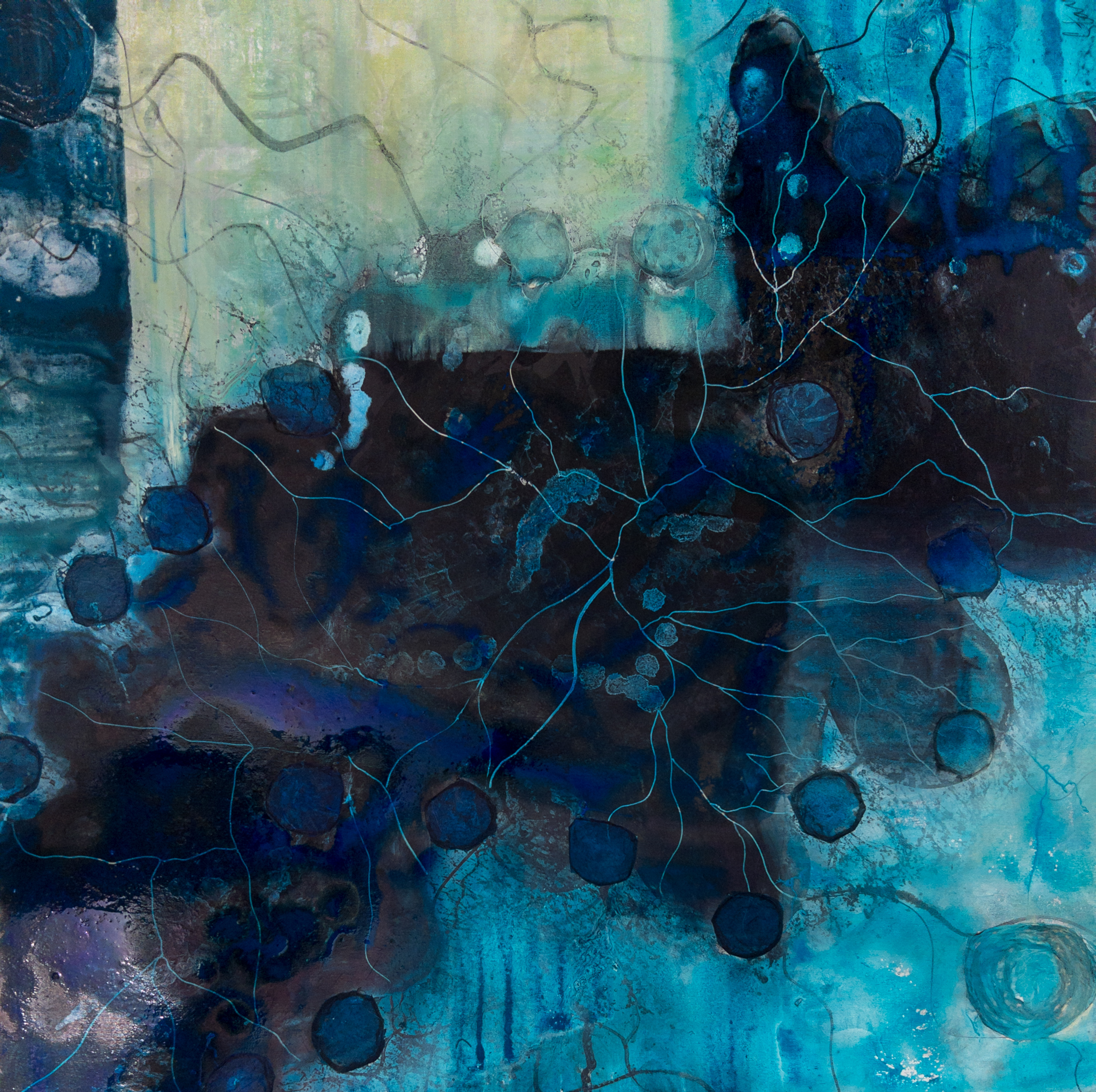 My painting series is inspired by the elements of Earth and beyond and its organic depth of color. I see inspiration in landforms from above, water’s transparency and movement, rocks and minerals and their multiple layers of colors. Many of the materials used in painting are derived from elements of the earth and I use these elements to build something abstract and yet symbolic of what our planet is made of. Circles also have a symbolic meaning of infinity, balance, returning cycles, and the cosmos. I am creating a story of our planet but most importantly a dialogue about climate change and what is infinite or finite. My paintings combine a mixed media of acrylic, oil, ink, and vinyl, spray paint, gold and bronze powder, mica, and melted plastic on linen canvas. We need to preserve our natural environment to create a more peaceful world.